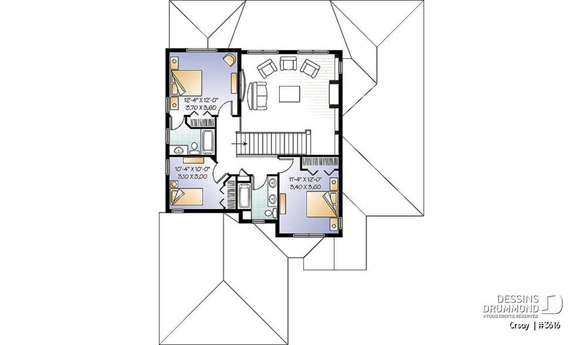 D’abord parce qu’il propose une belle volumétrie, des toitures suffisamment accentuées, un garage double et un porche abrité tant à l’avant qu’à l’arrière.