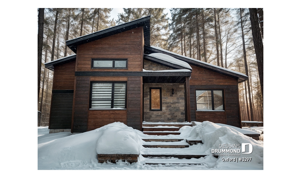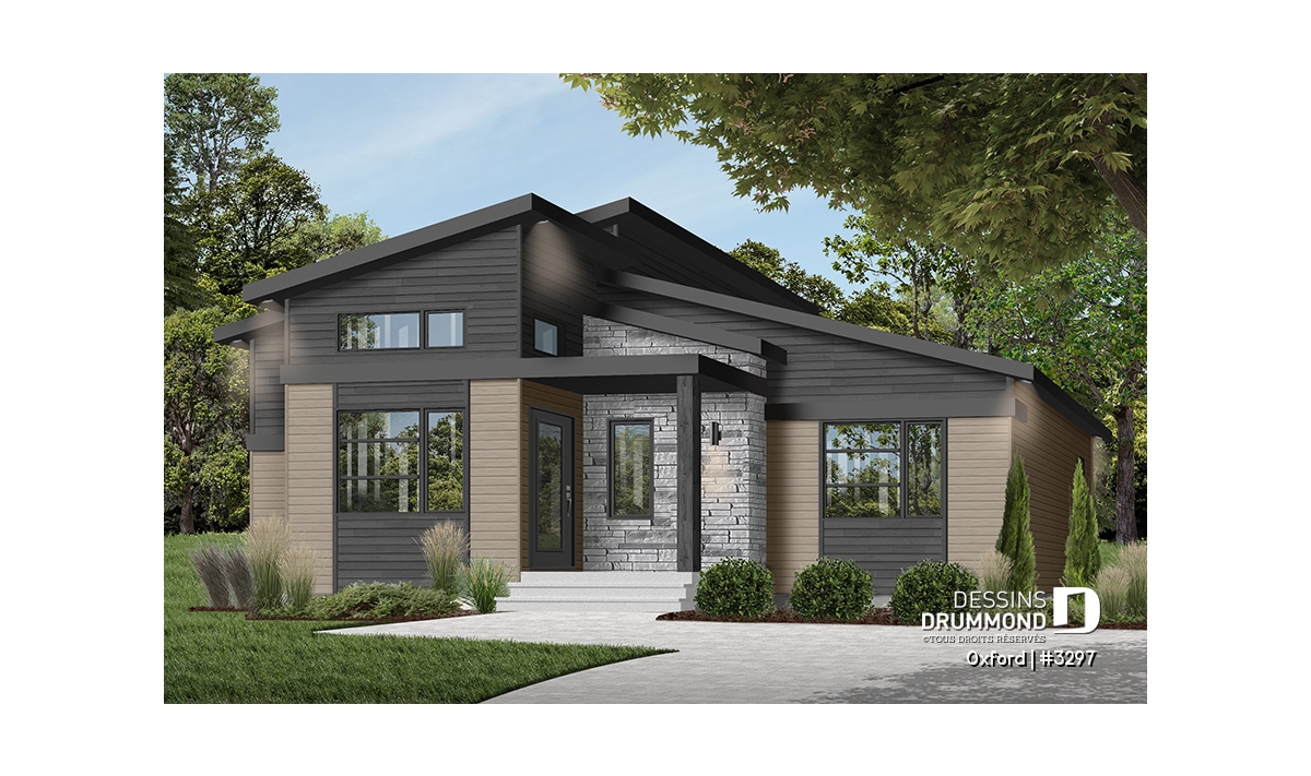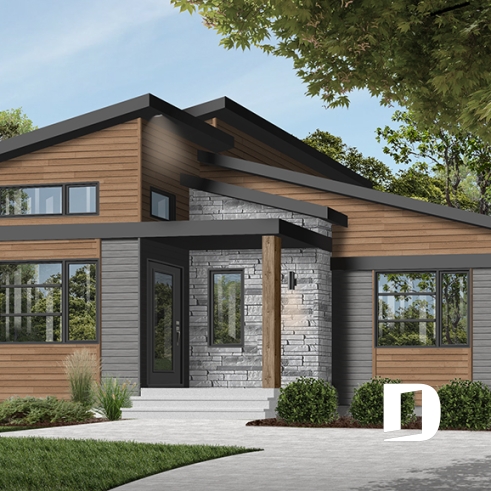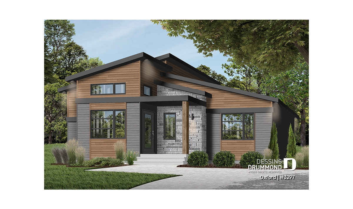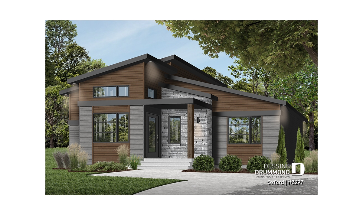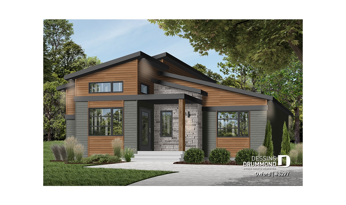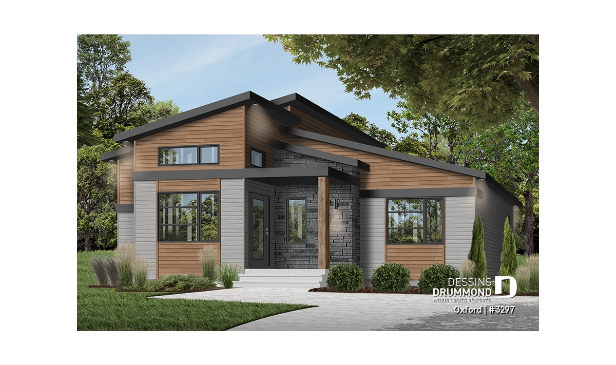 Superbe plan de plain-pied de style Mid-Century très tendance et proposant des matériaux nobles et chaleureux à la fois.