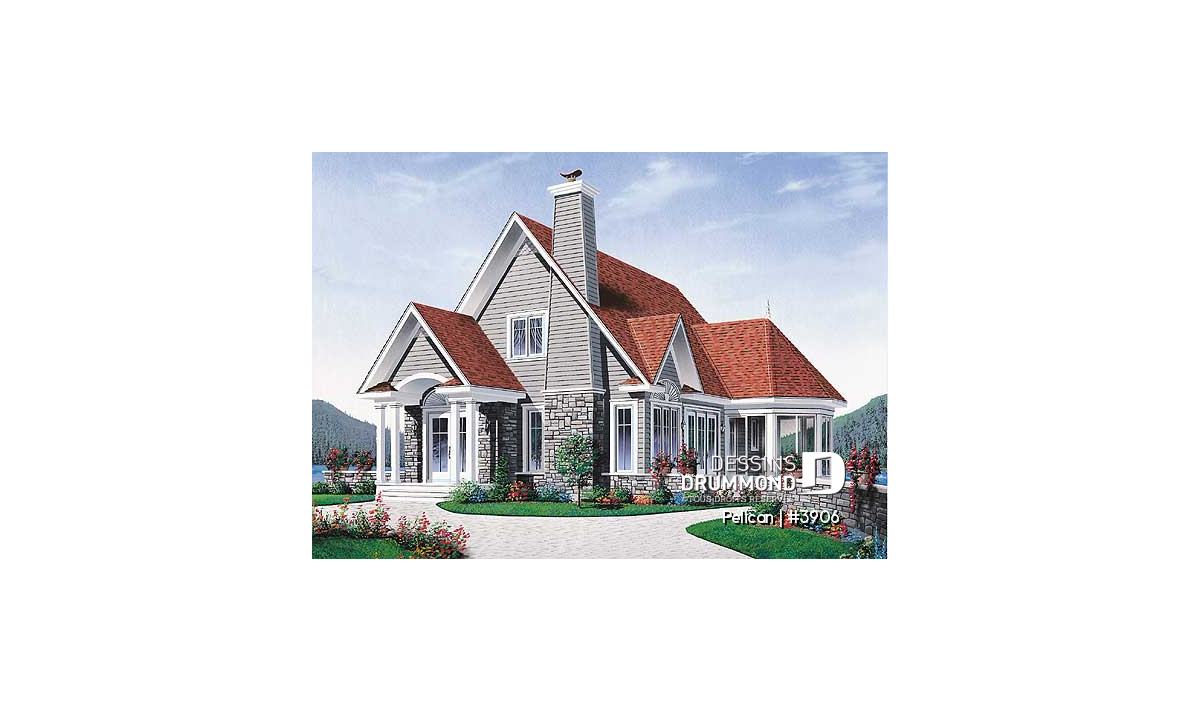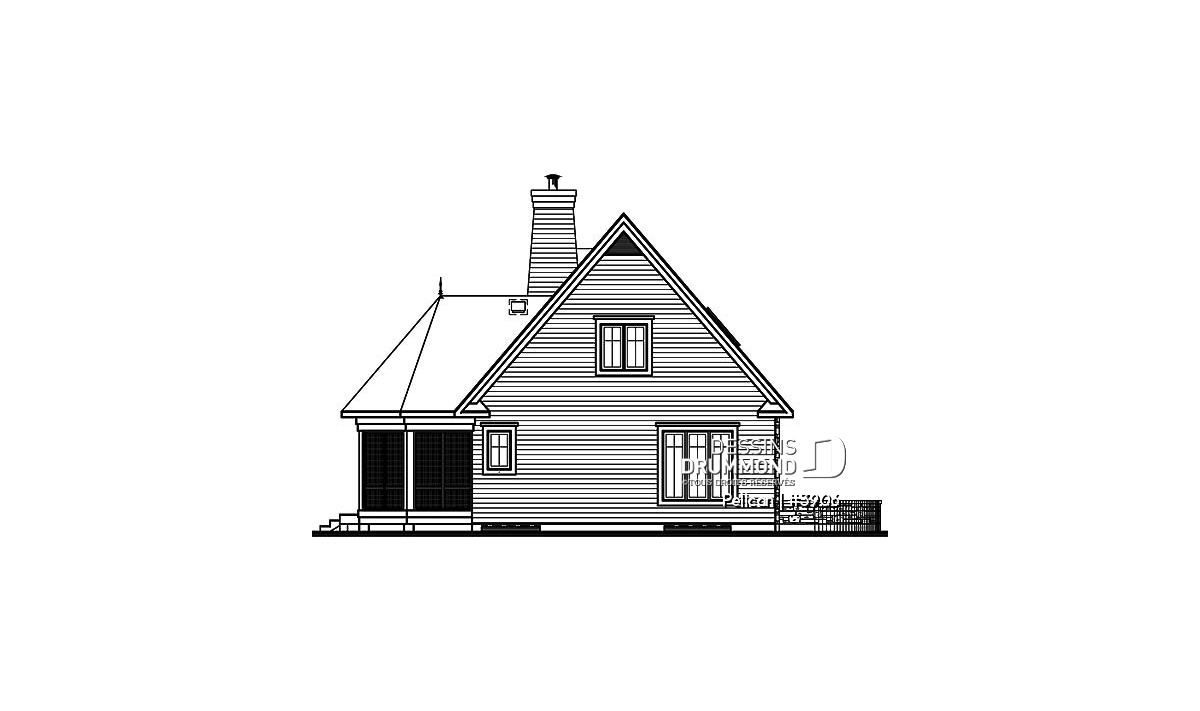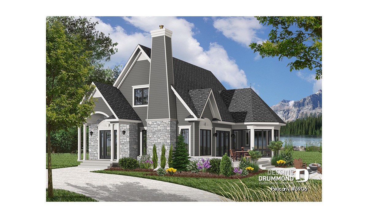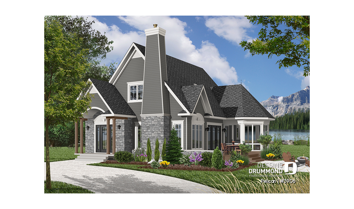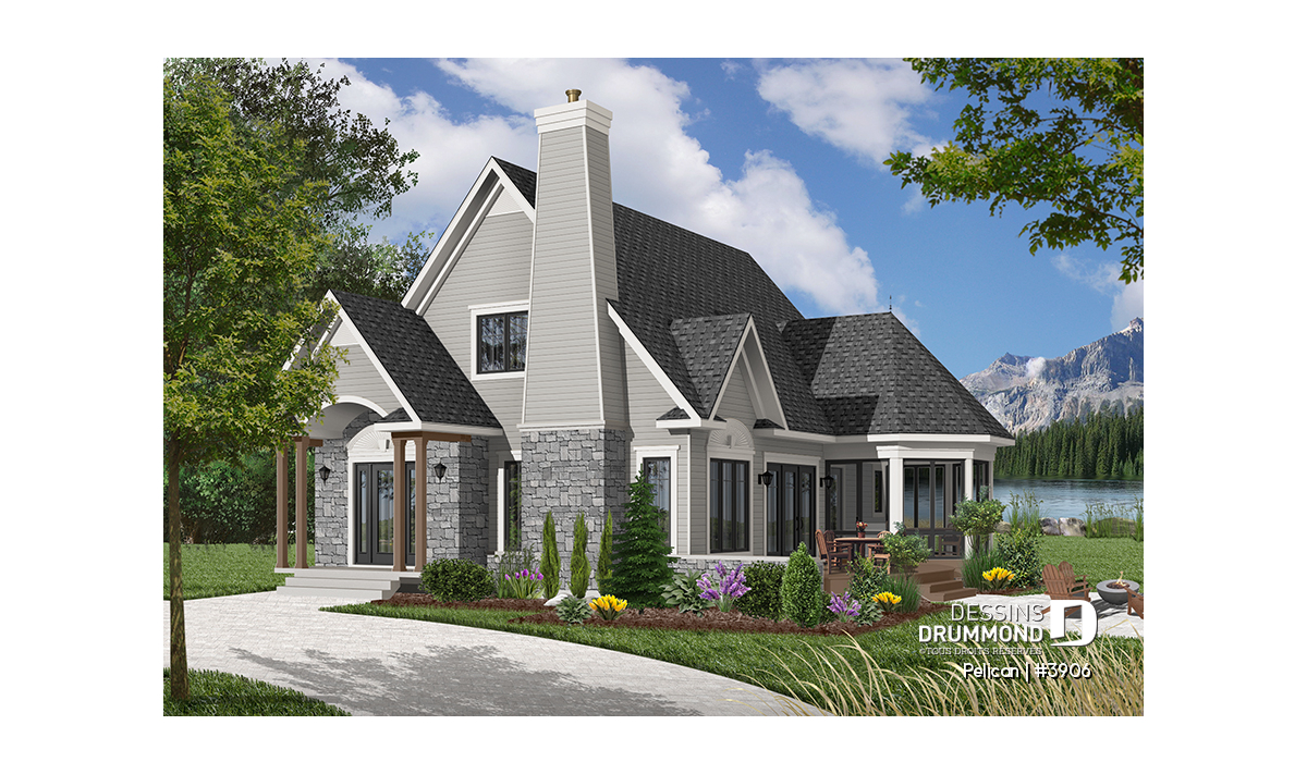 Modèl de maison style chalet, 3 chambres, 2 salles de bain, vestibule fermé, salle de séjour avec foyer