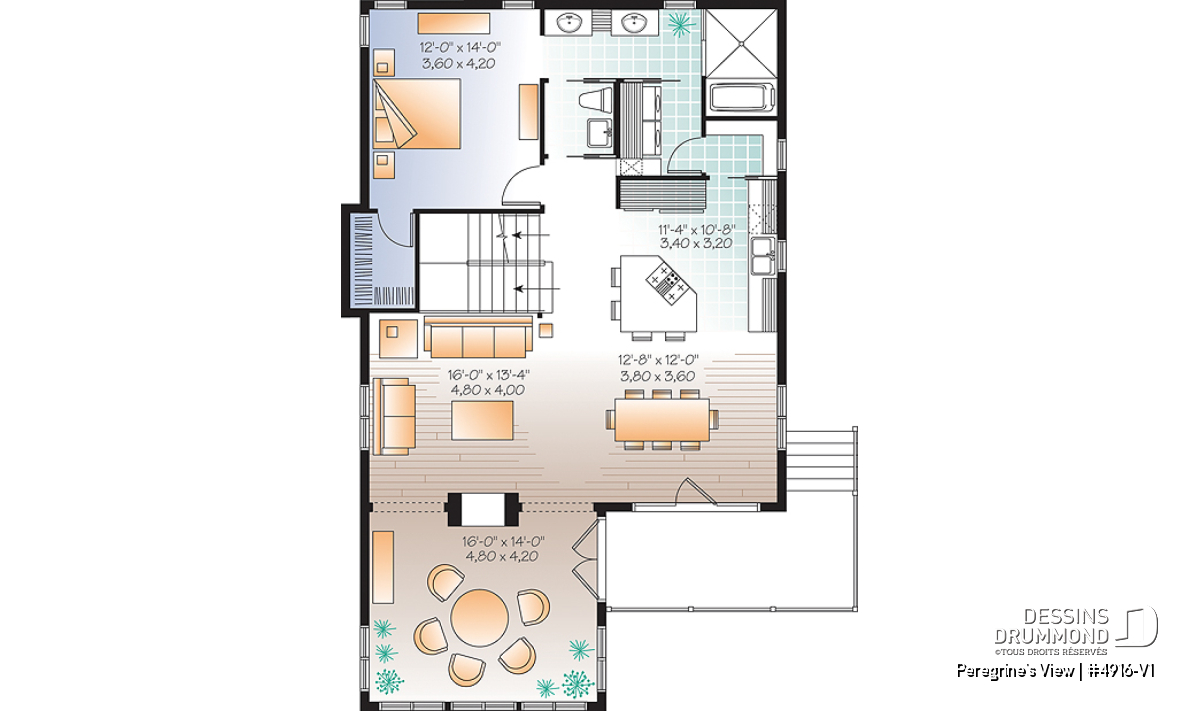 Du rez-de-chaussée l'espace familiale offre des vues panoramiques de plusieurs endroits et un bel ilot de cuisine. Le salon et la salle à manger ainsi qu'un joli solarium fenêtré sur trois côtés et un foyer à deux faces font de ce plan un endroit parfait pour terrain en pente sur une montagne ou au bord de l'eau. Une grande terrace offre l'endroit idéale pour profiter des mois chauds.