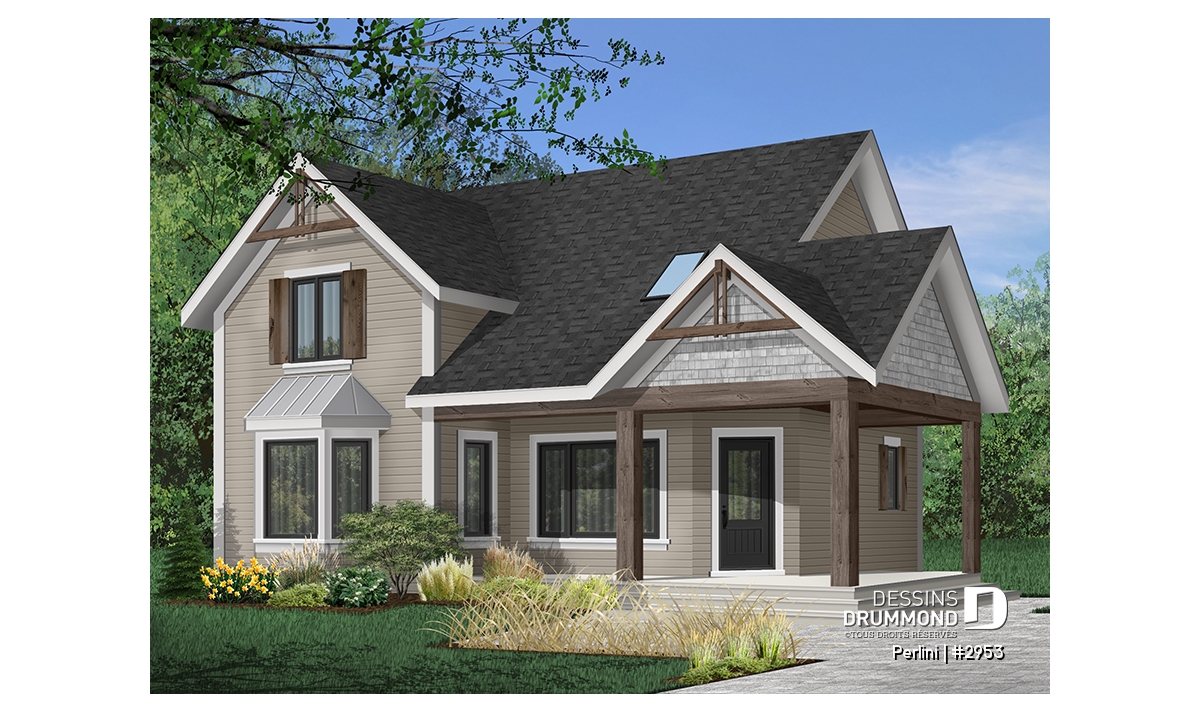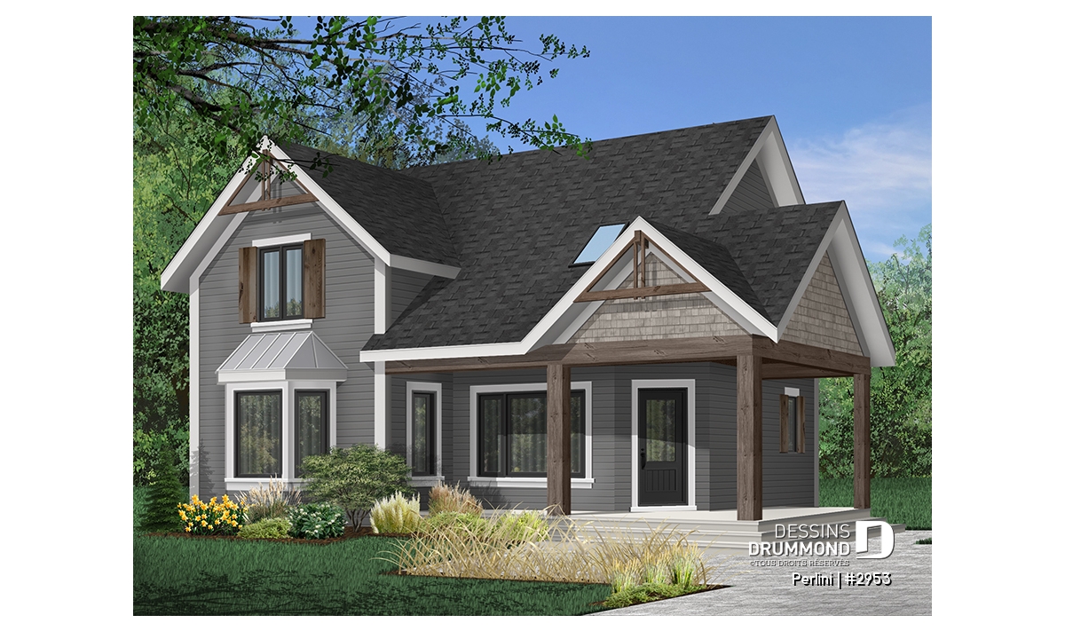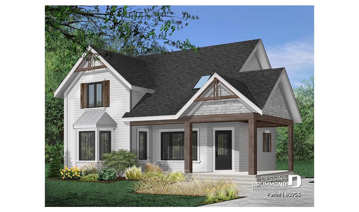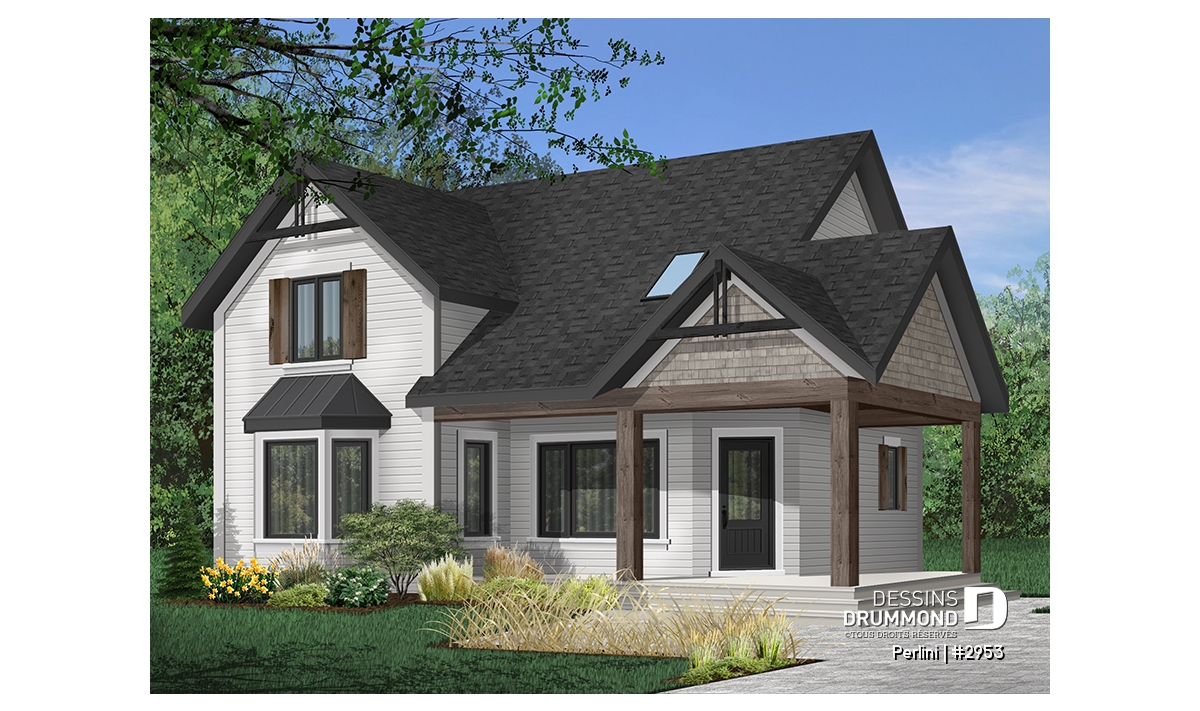 Version couleur no. 9 - Vue avant - Plan de style fermette champêtre, grand vestiaire d'entrée, cuisine avec îlot, galerie couverte, 3 chambres - Perlini