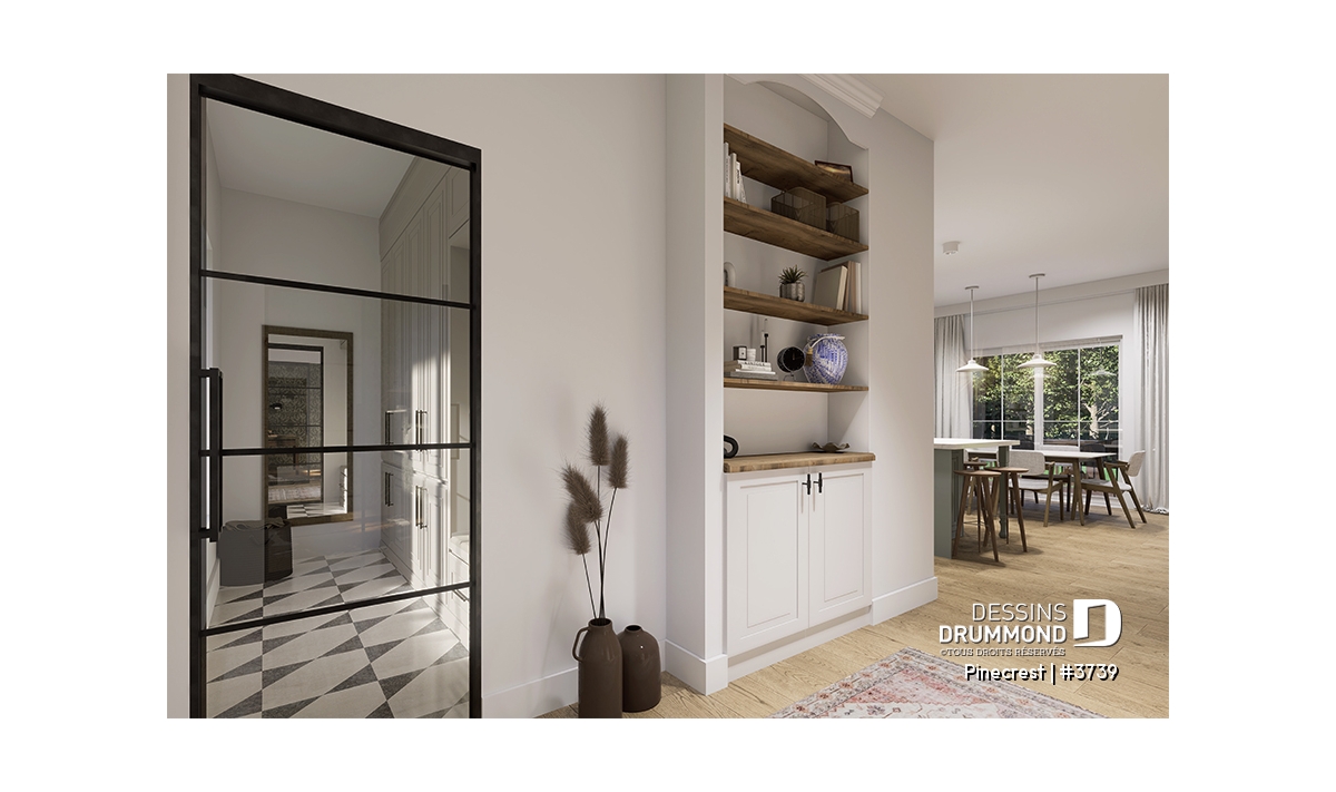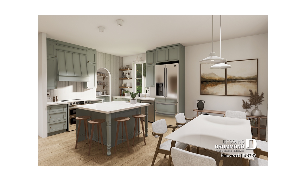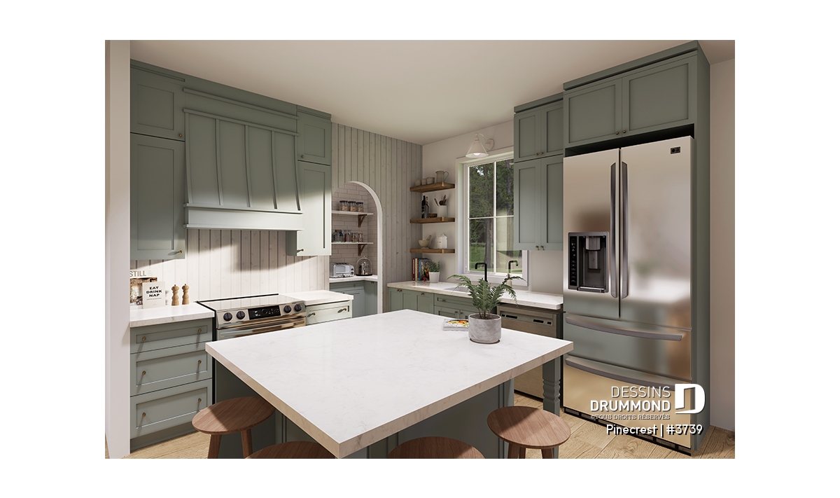 La cuisine a un îlot ainsi qu'un grand et pratique garde-manger. Une arche architecturale est prévue entre la cuisine et le garde-manger pour donner un beau look à ce coin!