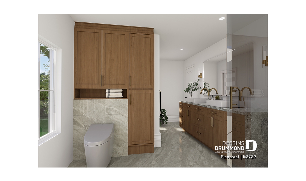 La salle de bain familiale est très spacieuse et comporte deux lavabos séparés, une douche et un bain auto-portant. De plus un secteur a été aménagé en salle de lavage et inclut même une petite fenêtre.