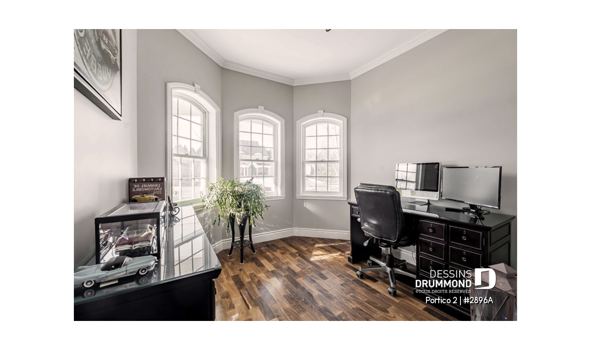 Un bureau à domicile aménagé dans la tourelle avant offre un espace inspirant pour le télétravail ou la lecture. À proximité de l’entrée de service, un escalier mène directement à l’espace boni situé au-dessus du garage : parfait pour une salle de jeux, un studio, ou un espace d’invités.