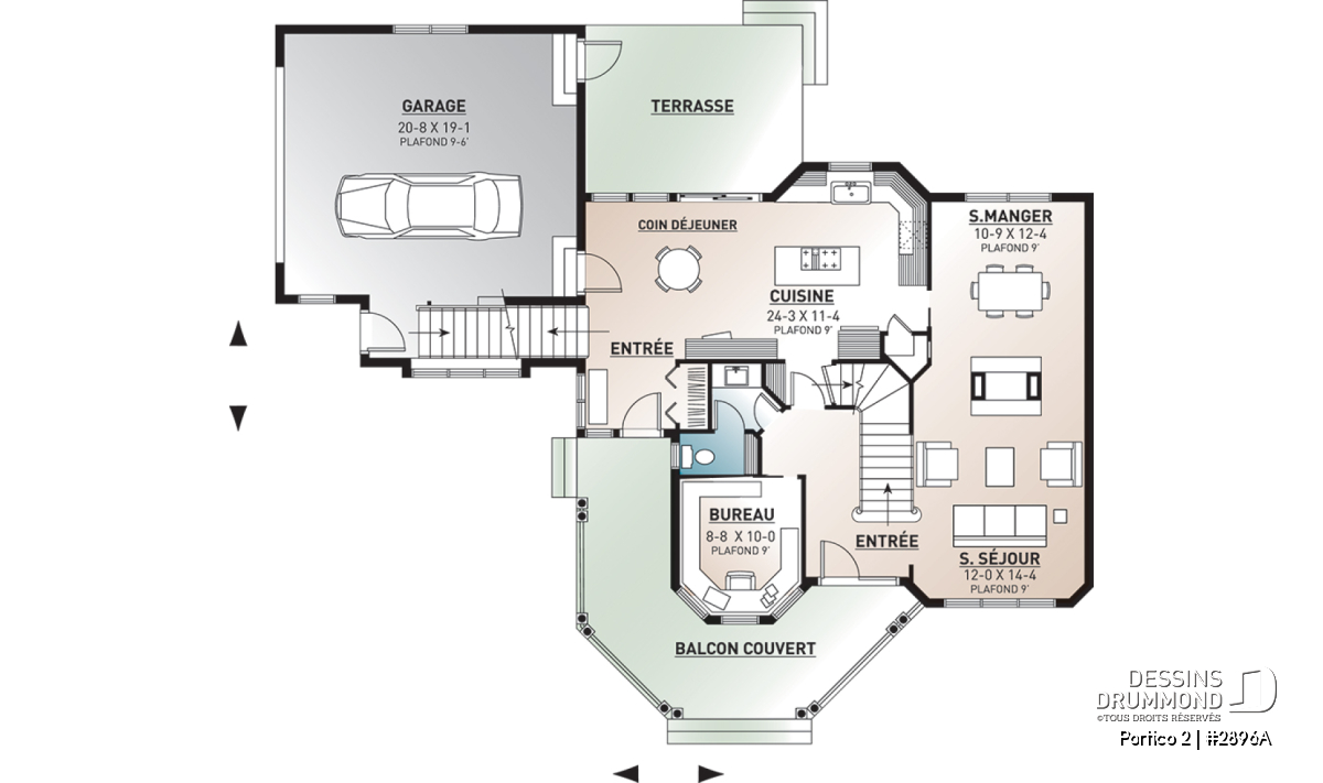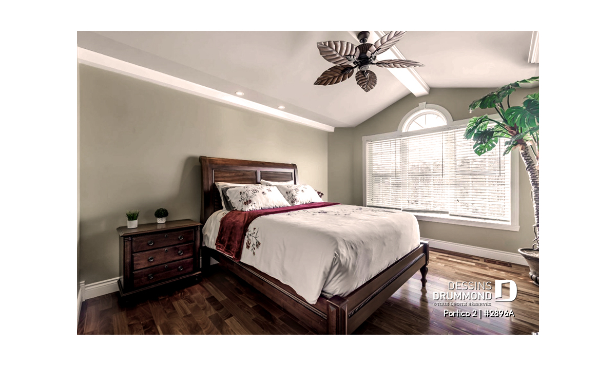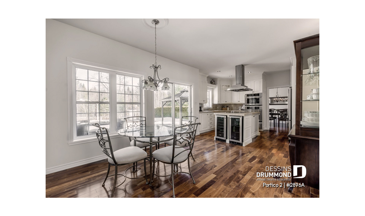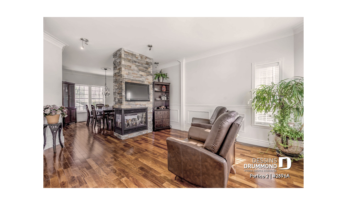 L’accès latéral au garage permet de créer une façade principale fenêtrée particulièrement élégante, contribuant au chic et à la popularité de ce modèle.