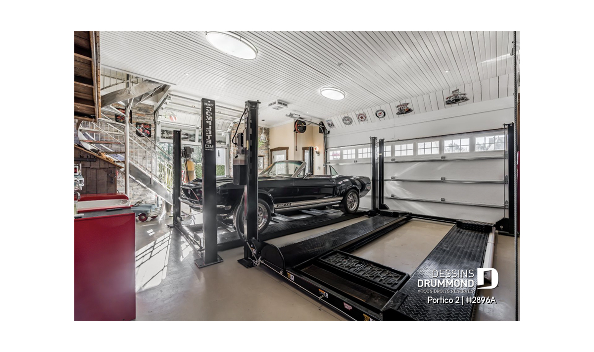 Garage double avec espace boni à l’étage accessible par escalier.