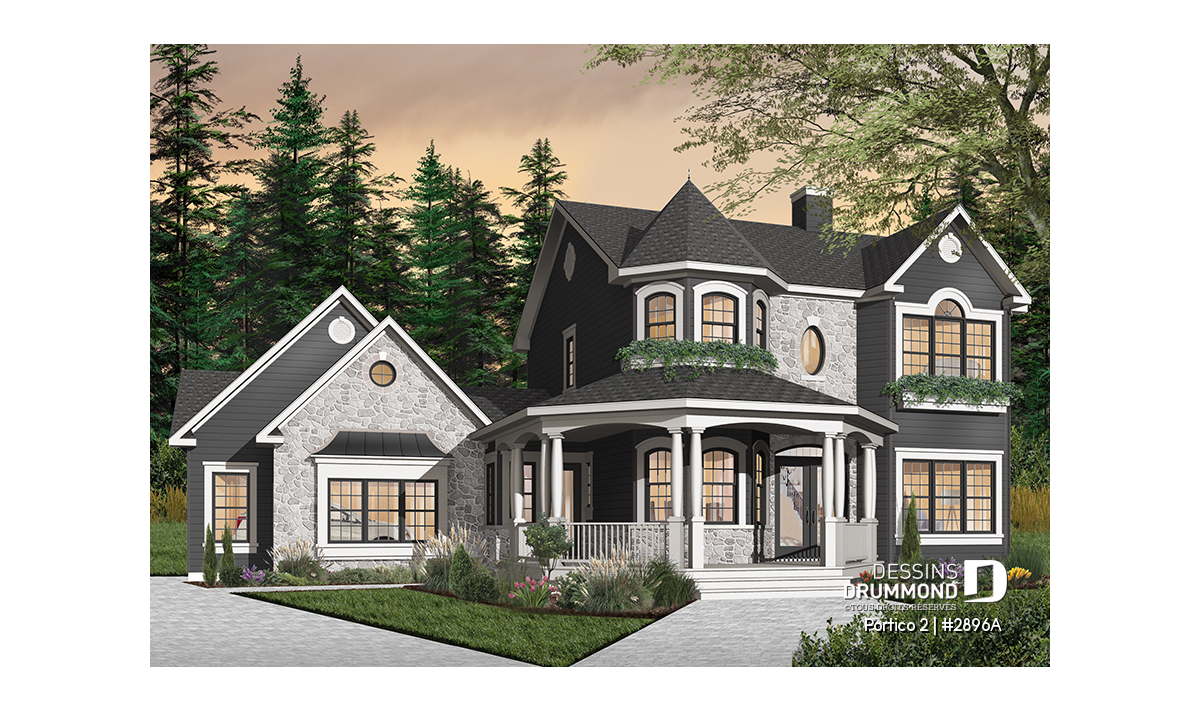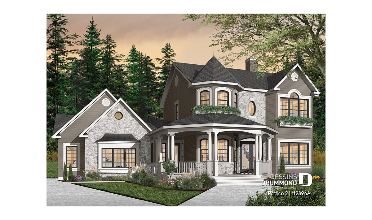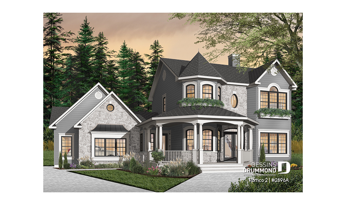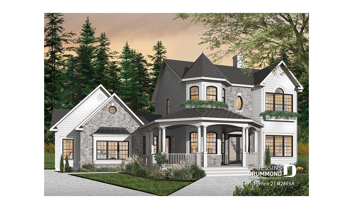 Ce plan de maison à étage de style victorien allie élégance intemporelle et fonctionnalité moderne. Conçu dans une pensée américaine, ce cottage se démarque à l’extérieur par sa superbe galerie avant qui épouse une tourelle d’angle reliant harmonieusement la maison au garage double. Ce détail architectural unique apporte à la fois cachet et distinction, tout en renforçant le caractère chaleureux de la demeure.