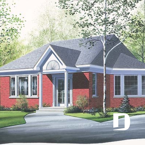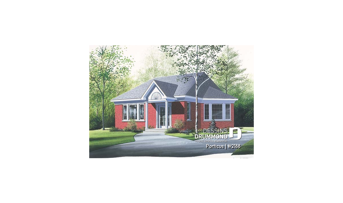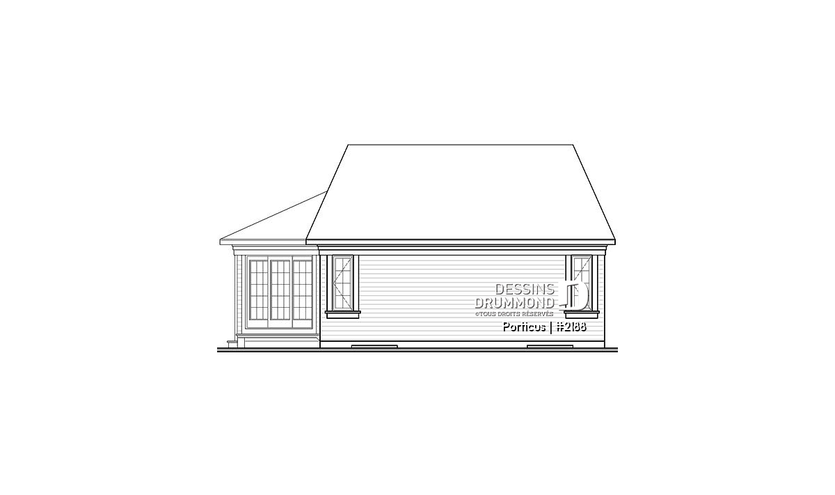 Vue avant - MODÈLE DE BASE - Plan de maison plain-pied 2 chambres, salle à manger bien fenêtrée - Porticus