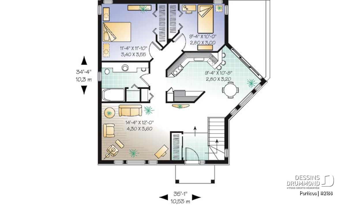 Rez-de-chaussée - Plan de maison plain-pied 2 chambres, salle à manger bien fenêtrée - Porticus