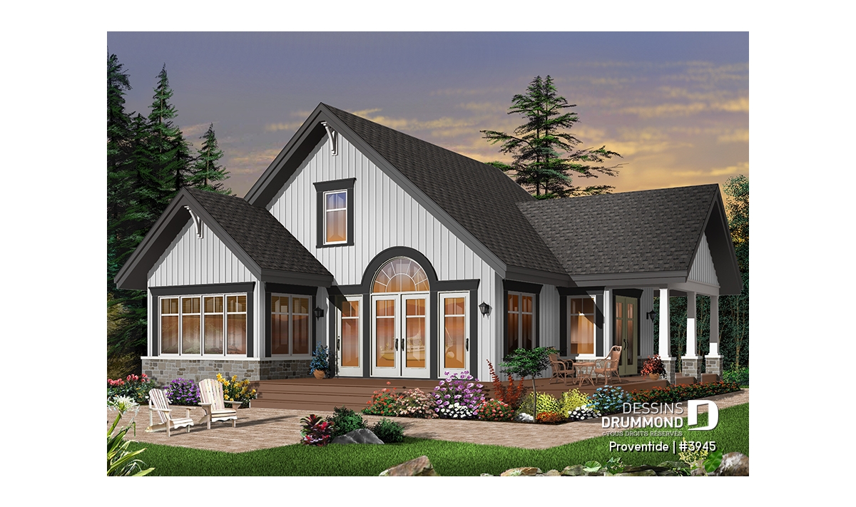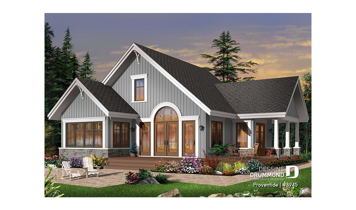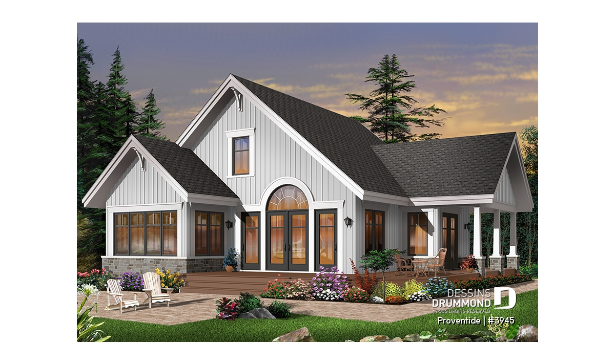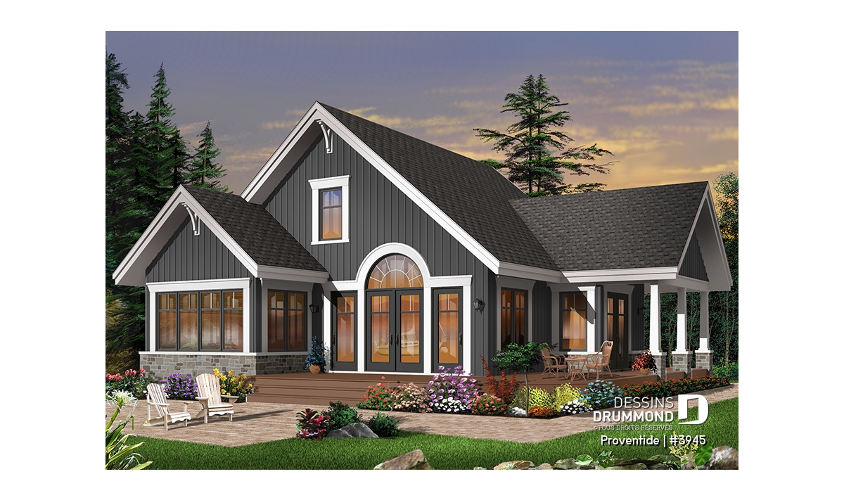 Réalisé dans le même esprit que le plan 2945, ce modèle-ci est entièrement pensé pour être aménagé sur un site avec vue panoramique avant. Avec sa porte de service, ou porte principale latérale, ce plan se veut tout de même véritablement invitant.