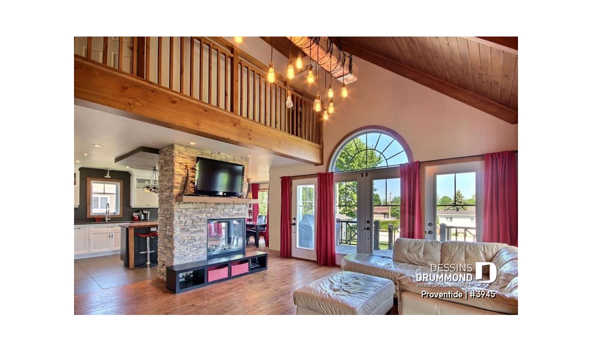 À l’intérieur, on entre d’abord dans un vestibule et ensuite, on est agréablement surpris par un aménagement intérieur tout en lumière et en parfaite communion avec l’extérieur. Une grande salle de séjour est accentuée par un plafond cathédrale et agrémentée d’un foyer, ouvert sur deux faces et partagé avec l’espace cuisine-dînette et la salle à manger.