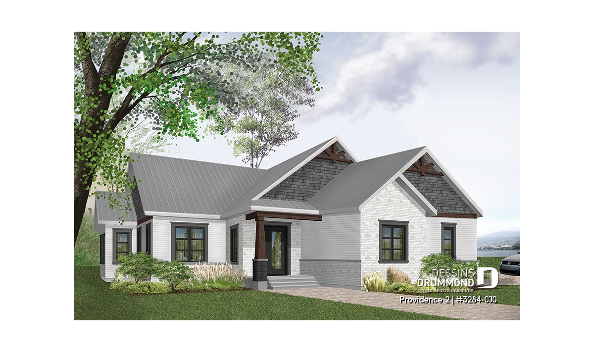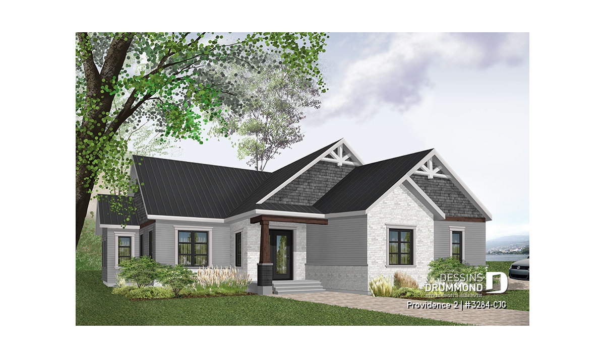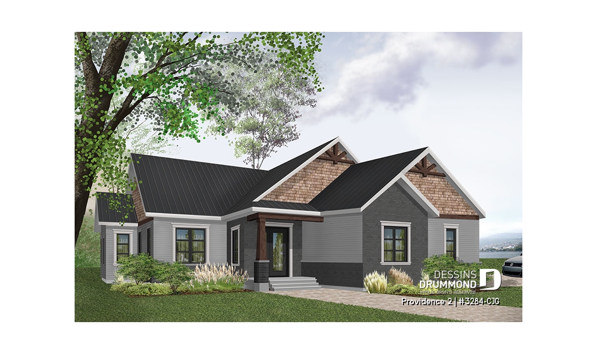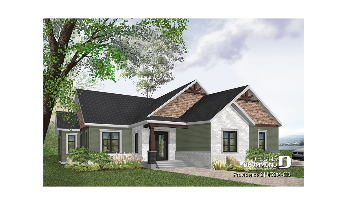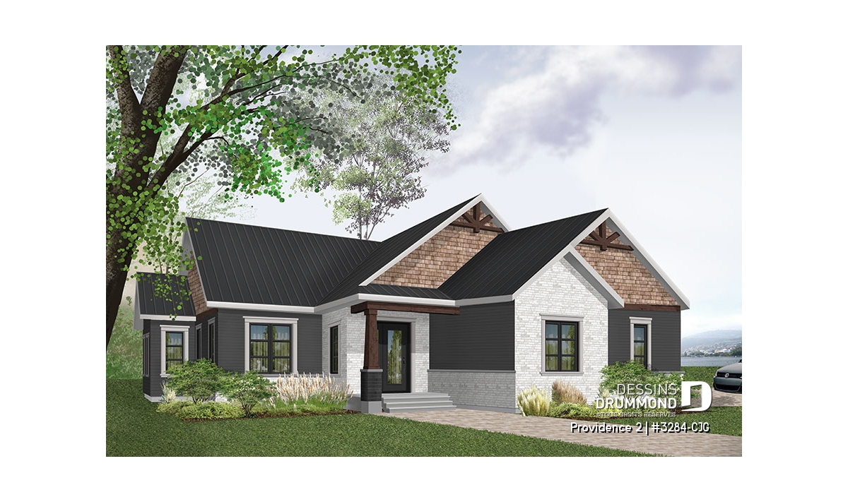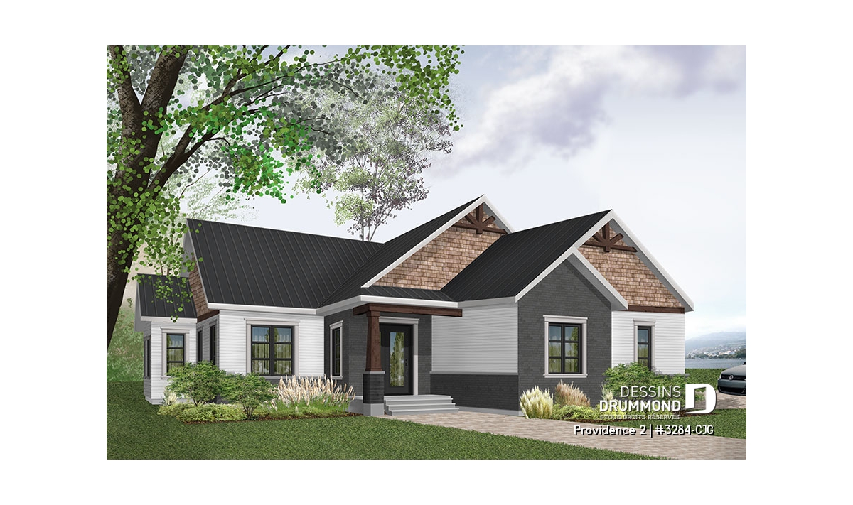 Se voulant répondre à une grande demande pour des modèles exposant des poutres de bois décoratives en façade, nous vous proposons ici une version dérivée du plan de base de cette nouvelle collection de plans de maison de style Craftsman, ou champêtre rustique (ou nordique), offrant 3 chambres. Cette variante propose donc un garage double avec entrée latérale, idéal pour terrain en coin de rue, ainsi qu'un accès direct à la maison du garage.