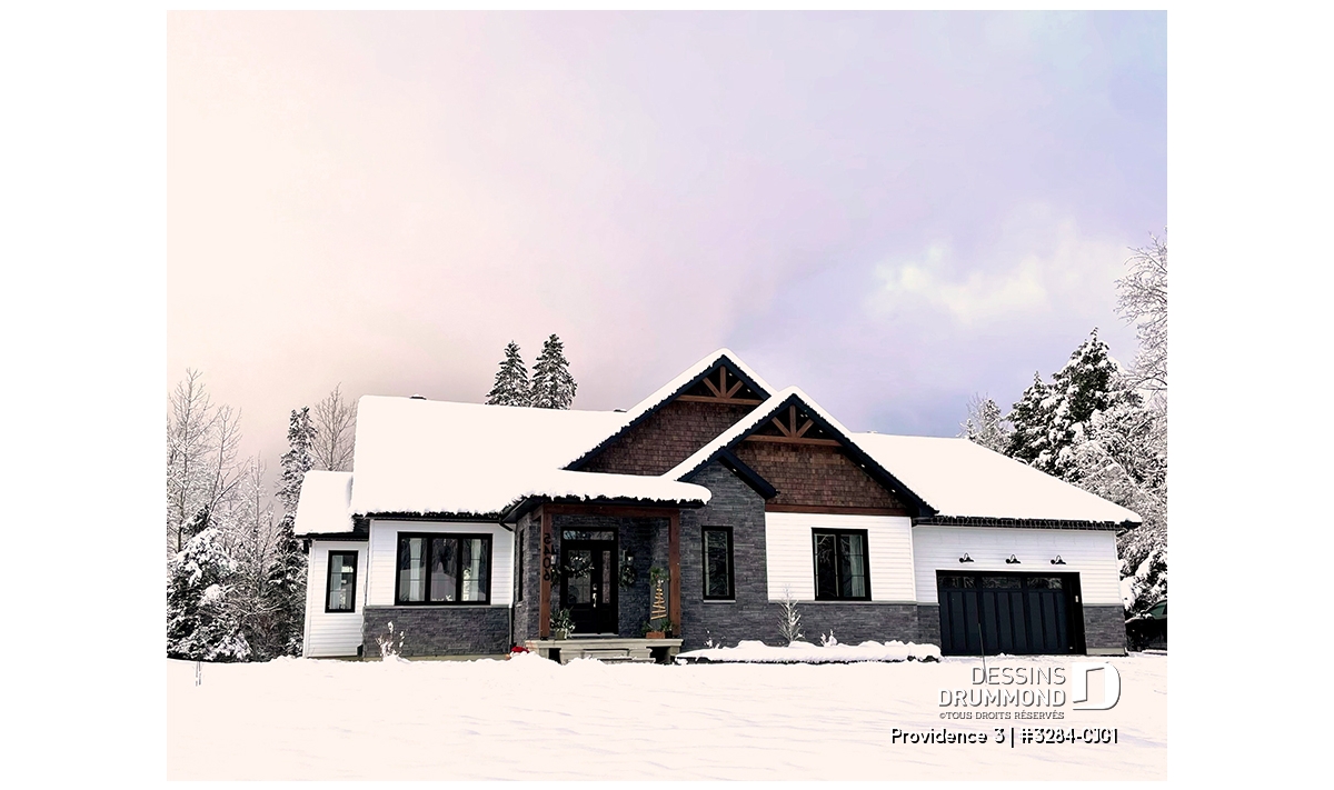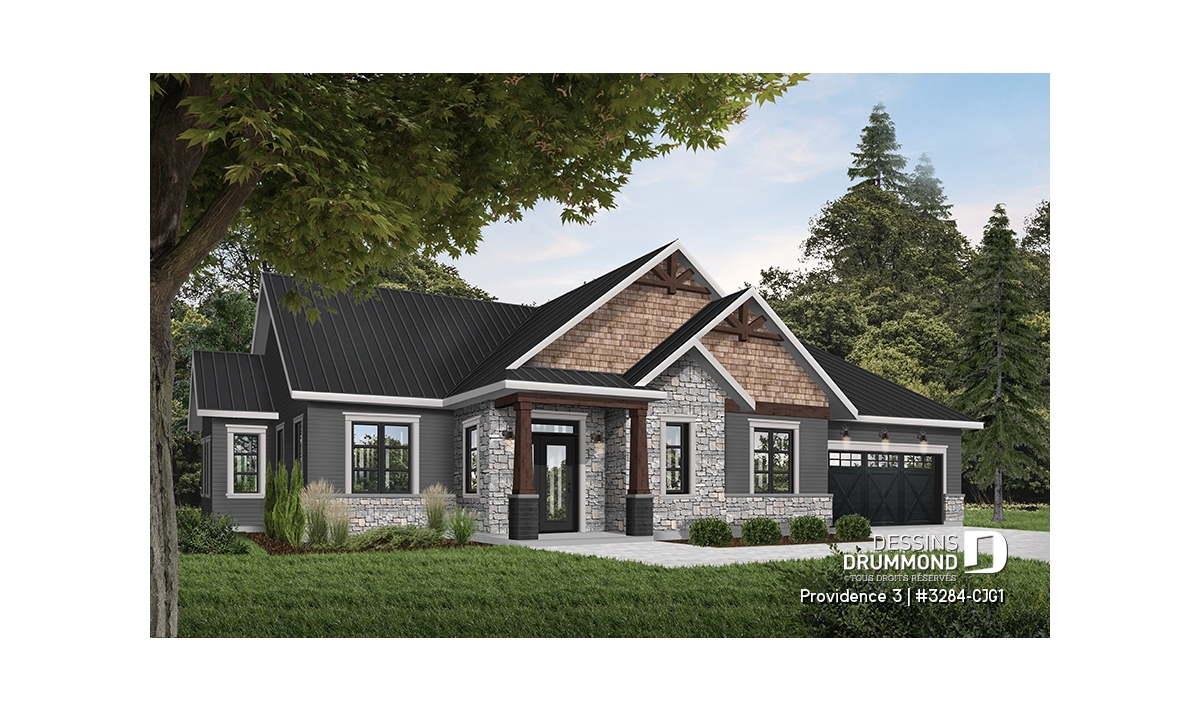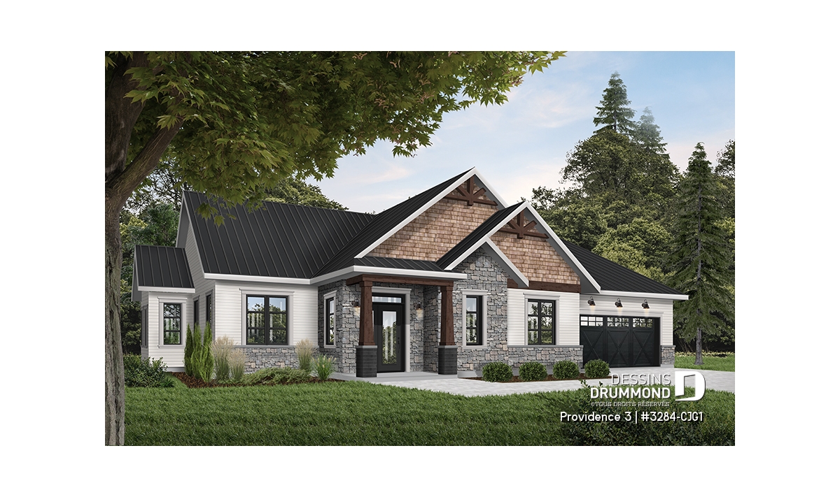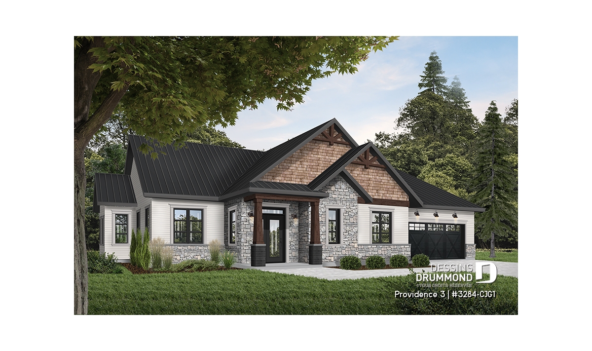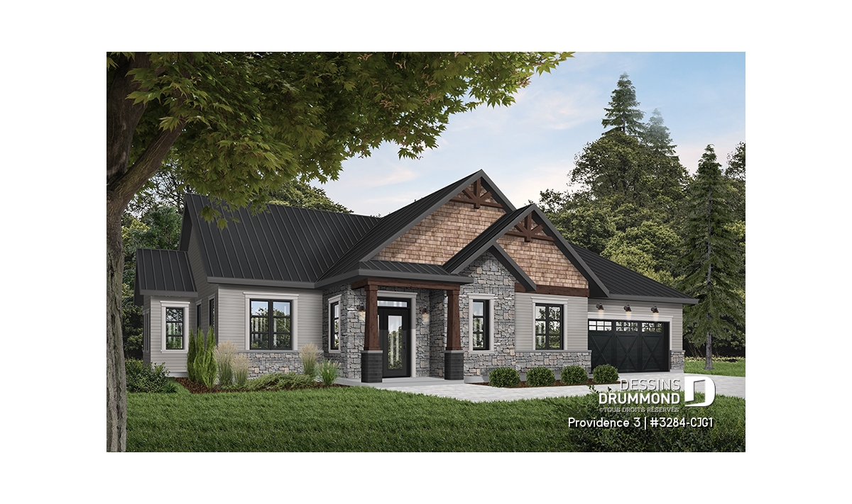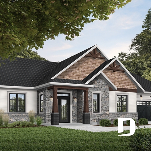Ce plan de maison plain-pied champêtre séduit au premier regard grâce à ses poutres décoratives, ses accents de pierre naturelle et son bardeau de cèdre qui lui confèrent un charme rustique et intemporel. Avec son allure chaleureuse et accueillante, ce modèle est idéal pour les familles qui recherchent à la fois confort, élégance et praticité.