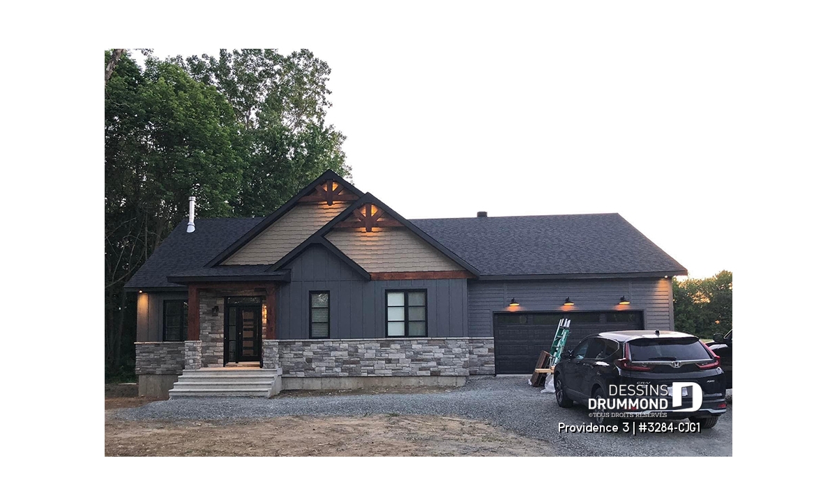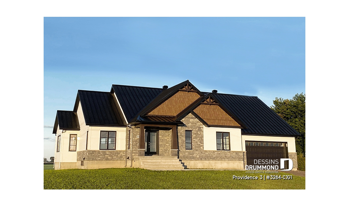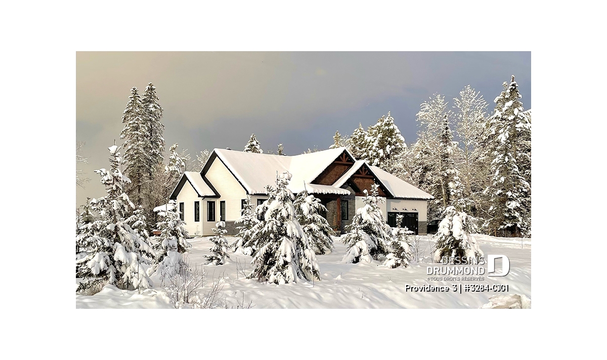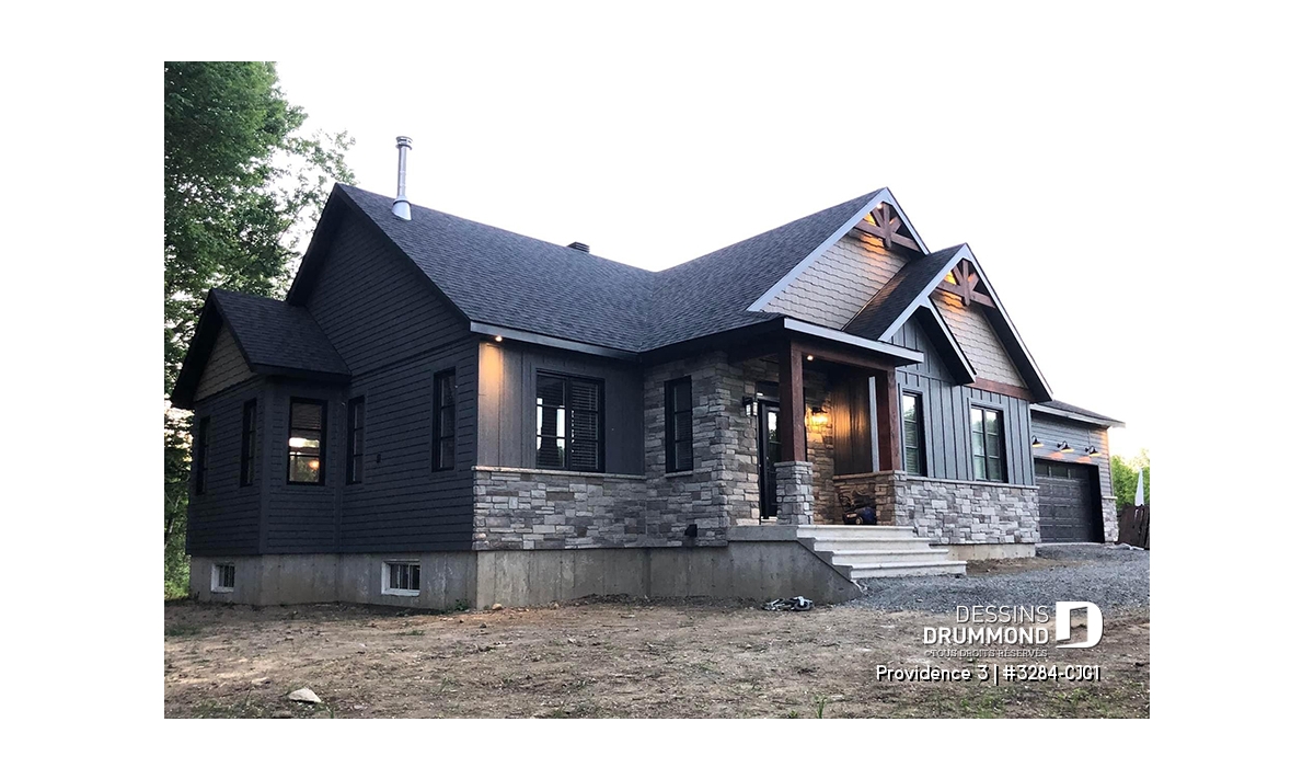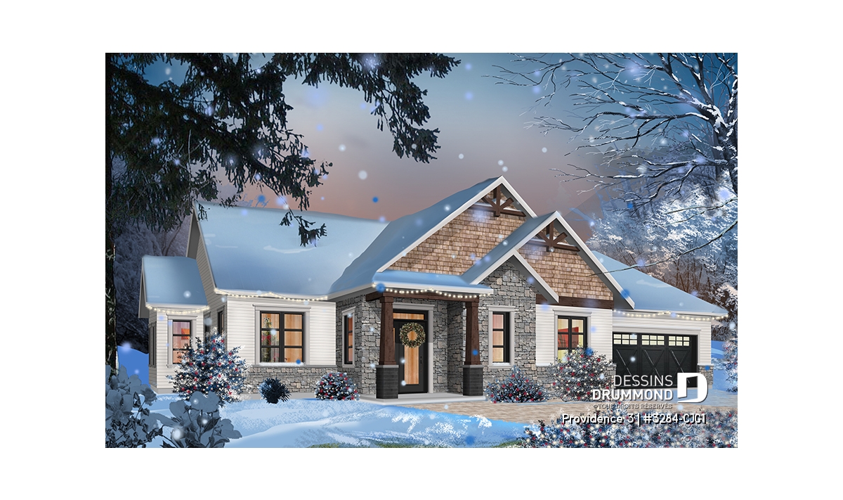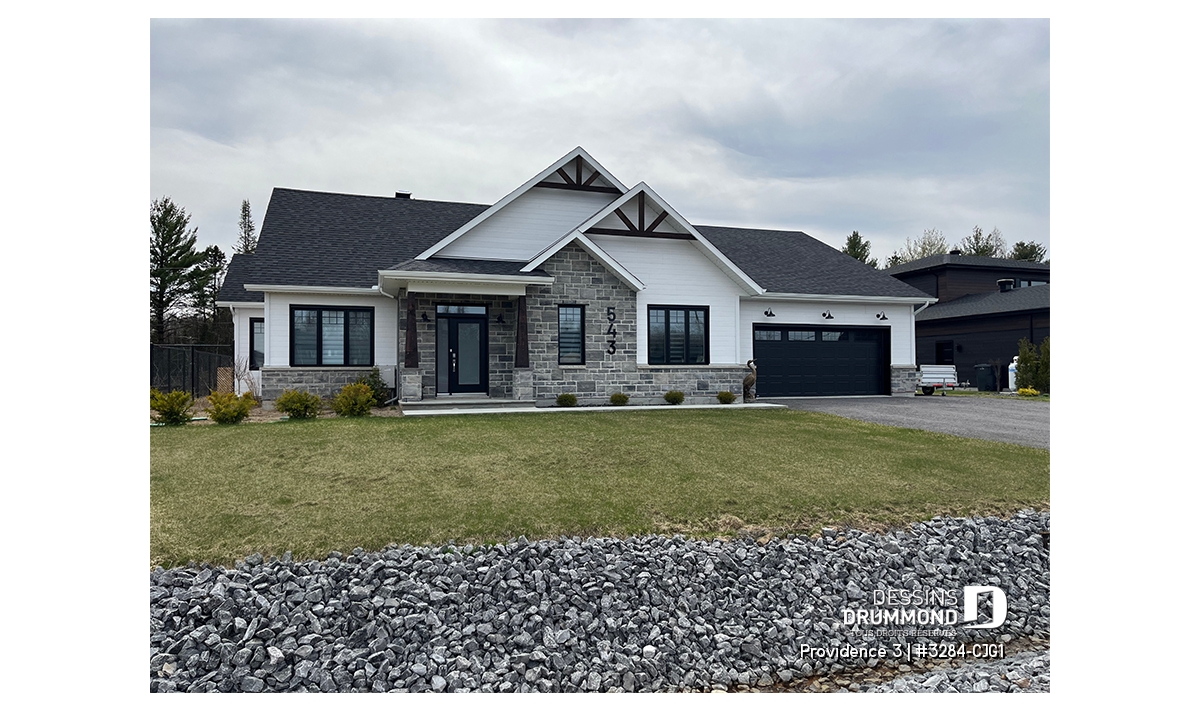 Ce plan de maison plain-pied champêtre séduit au premier regard grâce à ses poutres décoratives, ses accents de pierre naturelle et son bardeau de cèdre qui lui confèrent un charme rustique et intemporel. Avec son allure chaleureuse et accueillante, ce modèle est idéal pour les familles qui recherchent à la fois confort, élégance et praticité.