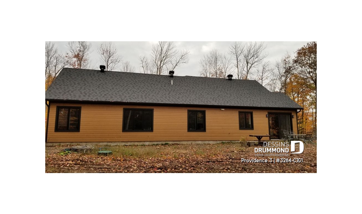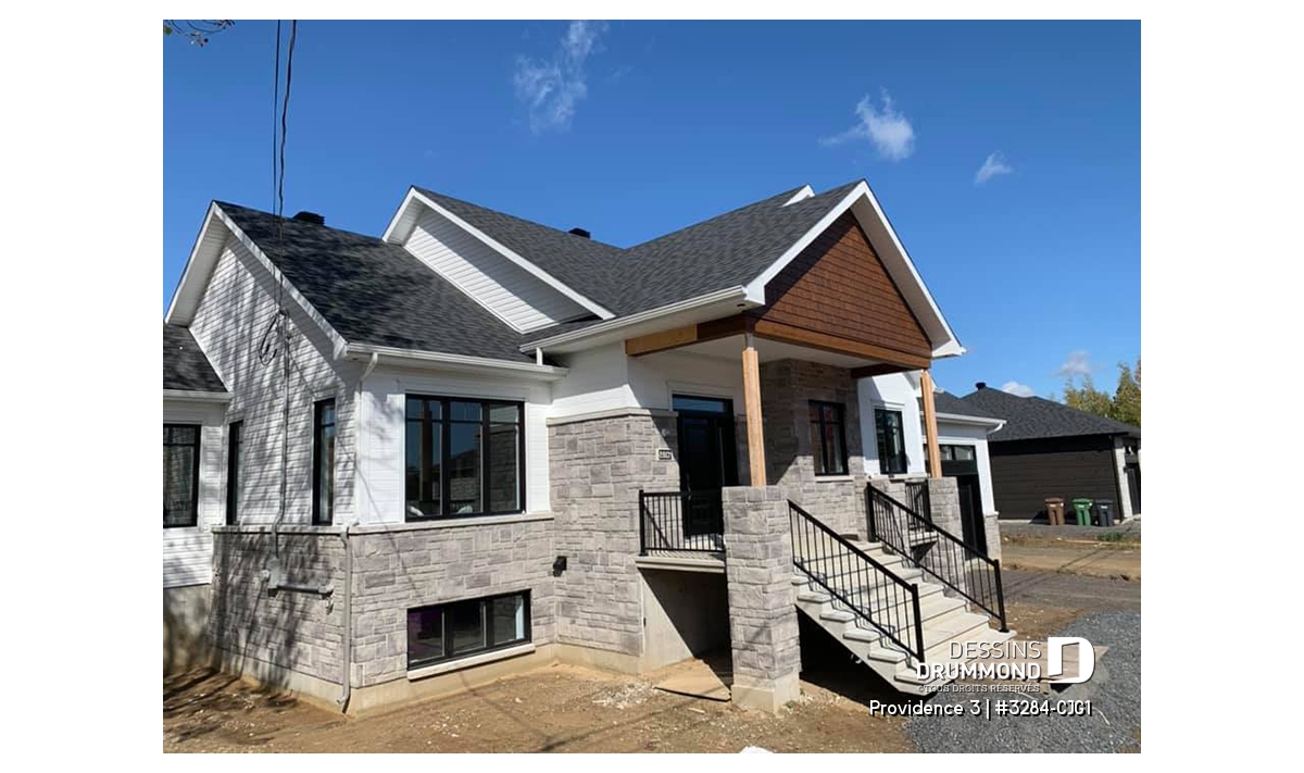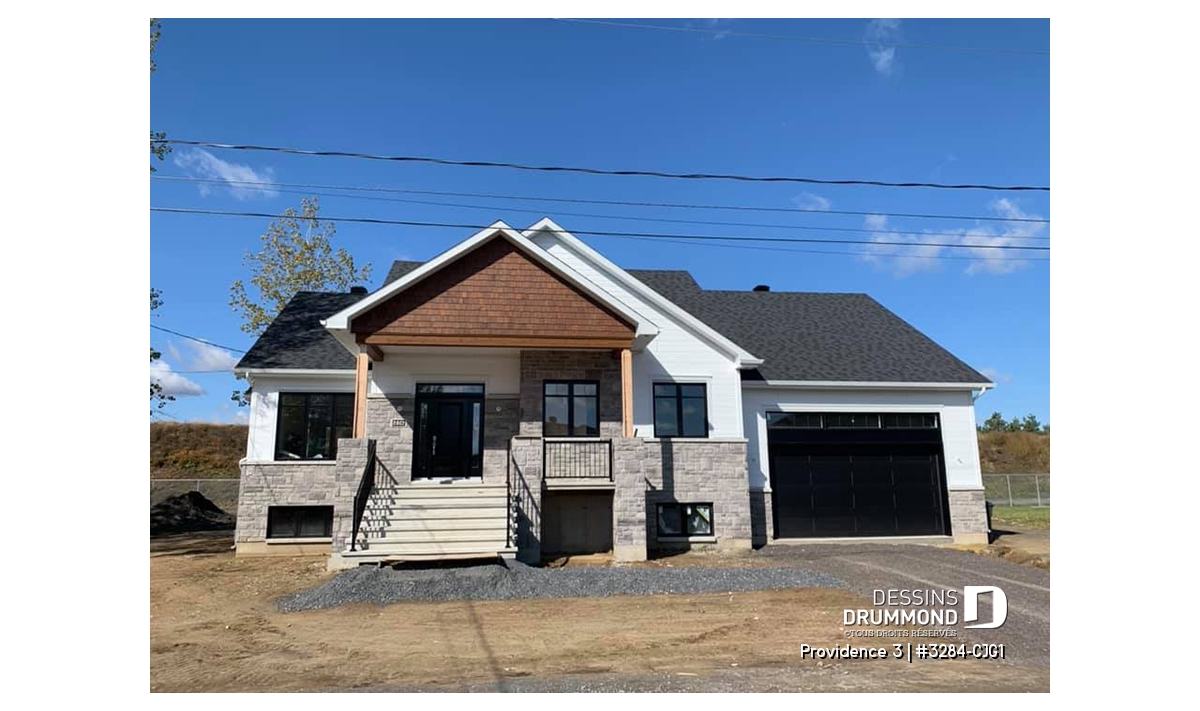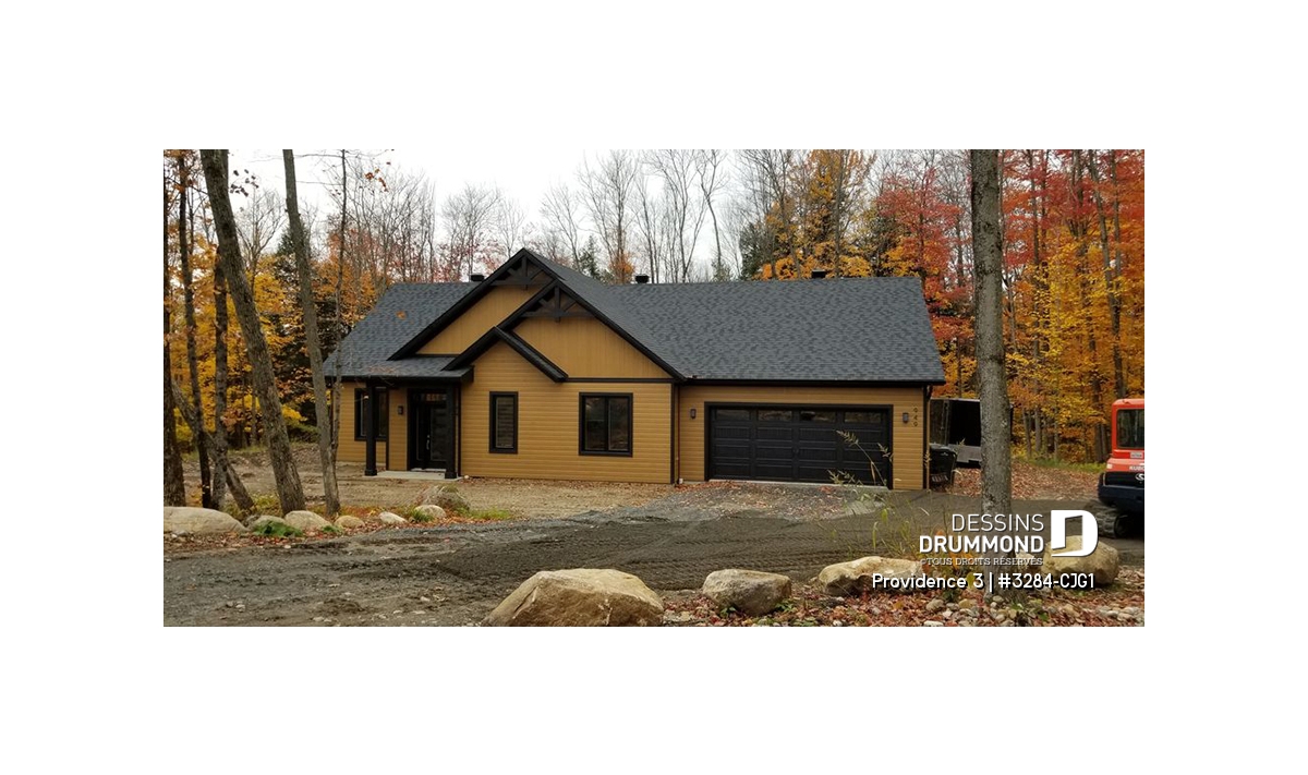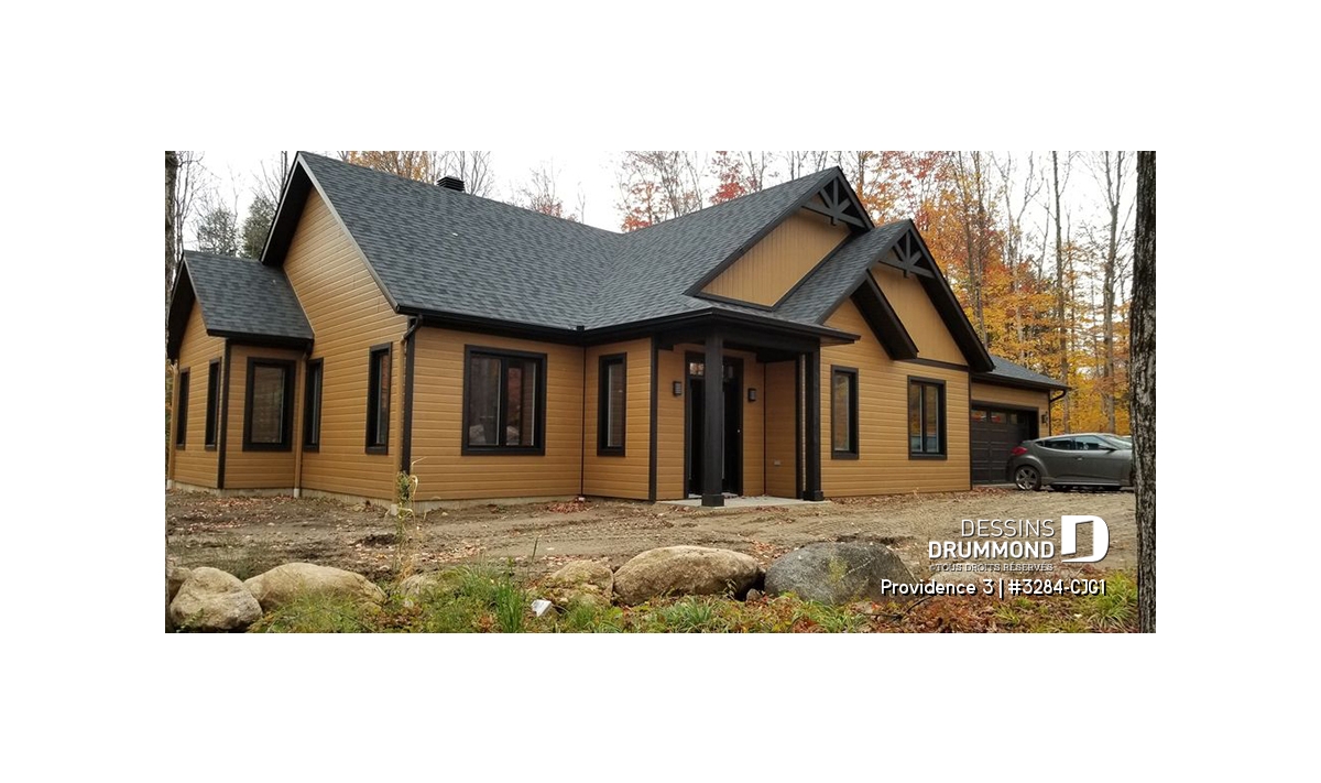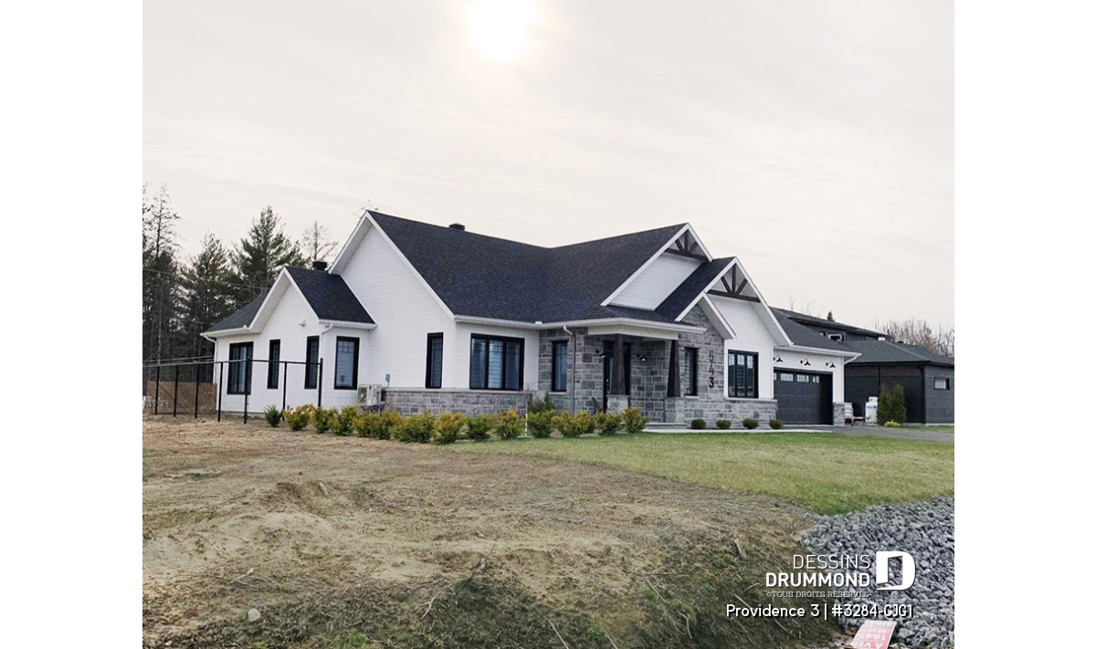 Ce plan de maison plain-pied champêtre séduit au premier regard grâce à ses poutres décoratives, ses accents de pierre naturelle et son bardeau de cèdre qui lui confèrent un charme rustique et intemporel. Avec son allure chaleureuse et accueillante, ce modèle est idéal pour les familles qui recherchent à la fois confort, élégance et praticité.