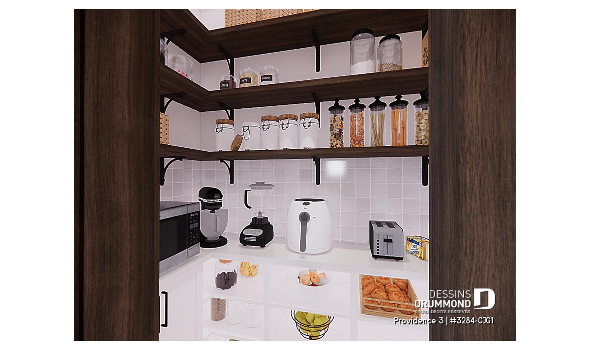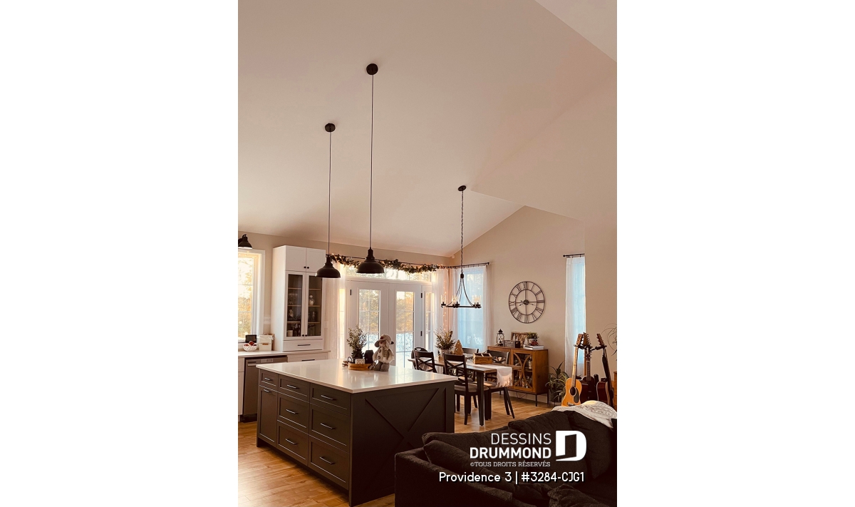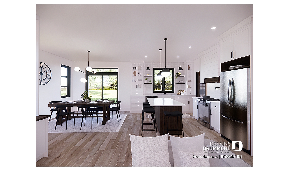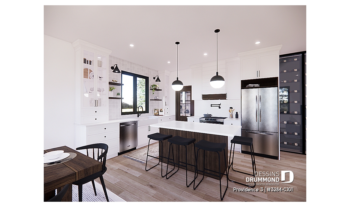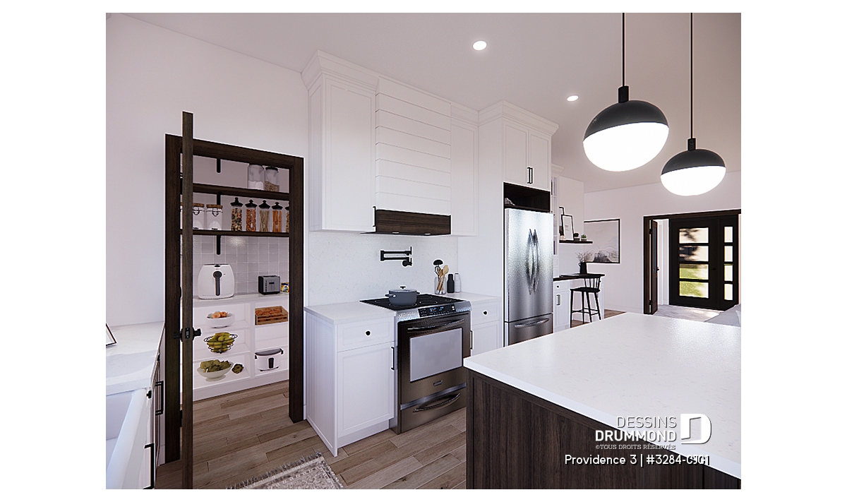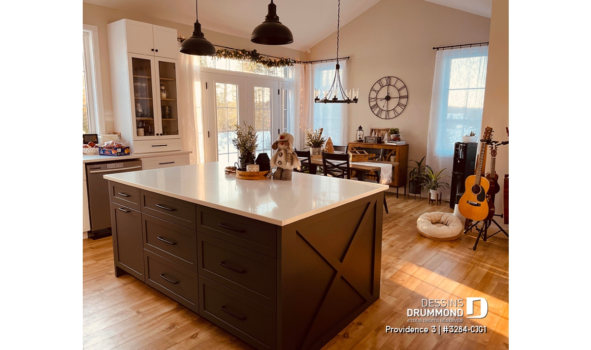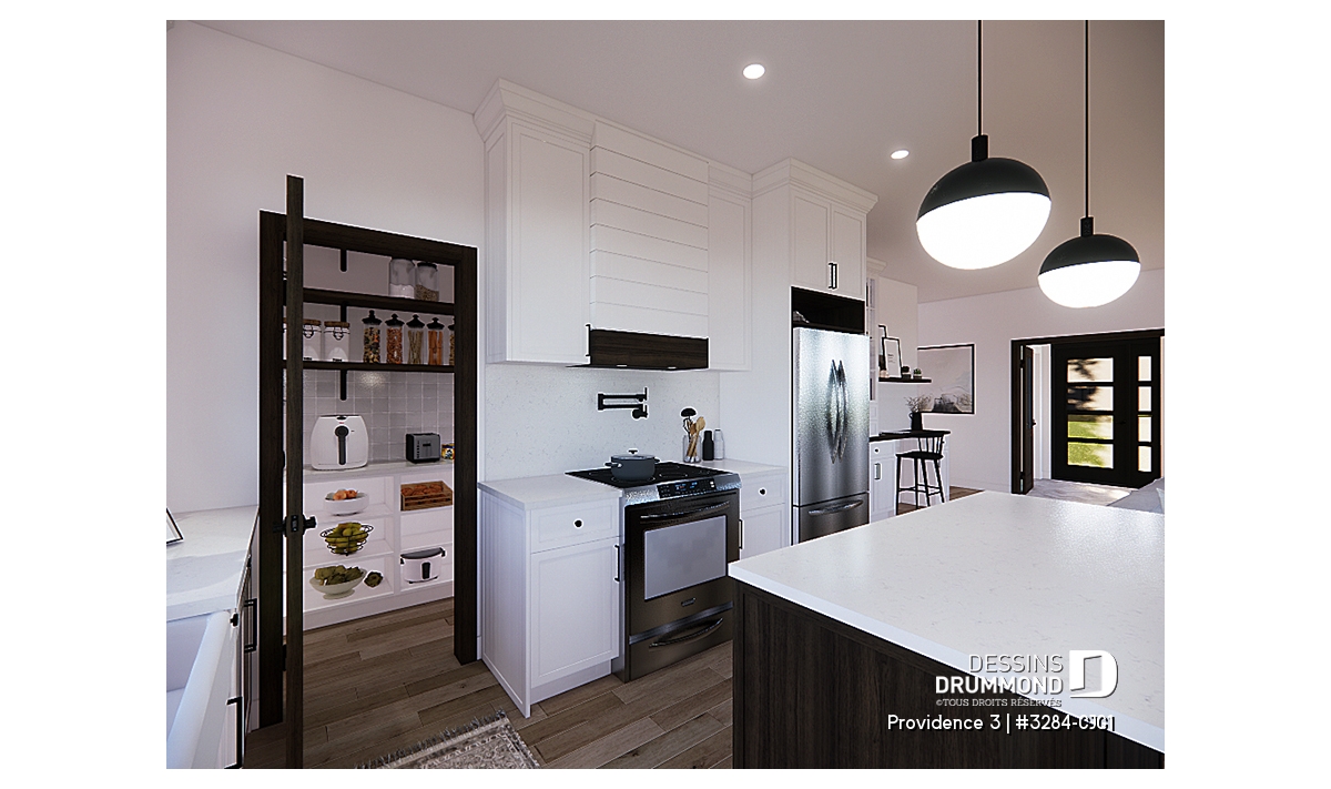 Cuisine conviviale avec grand îlot central et garde-manger généreux.