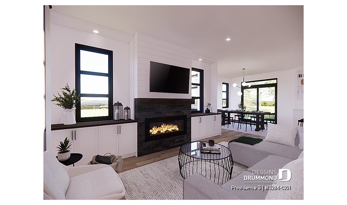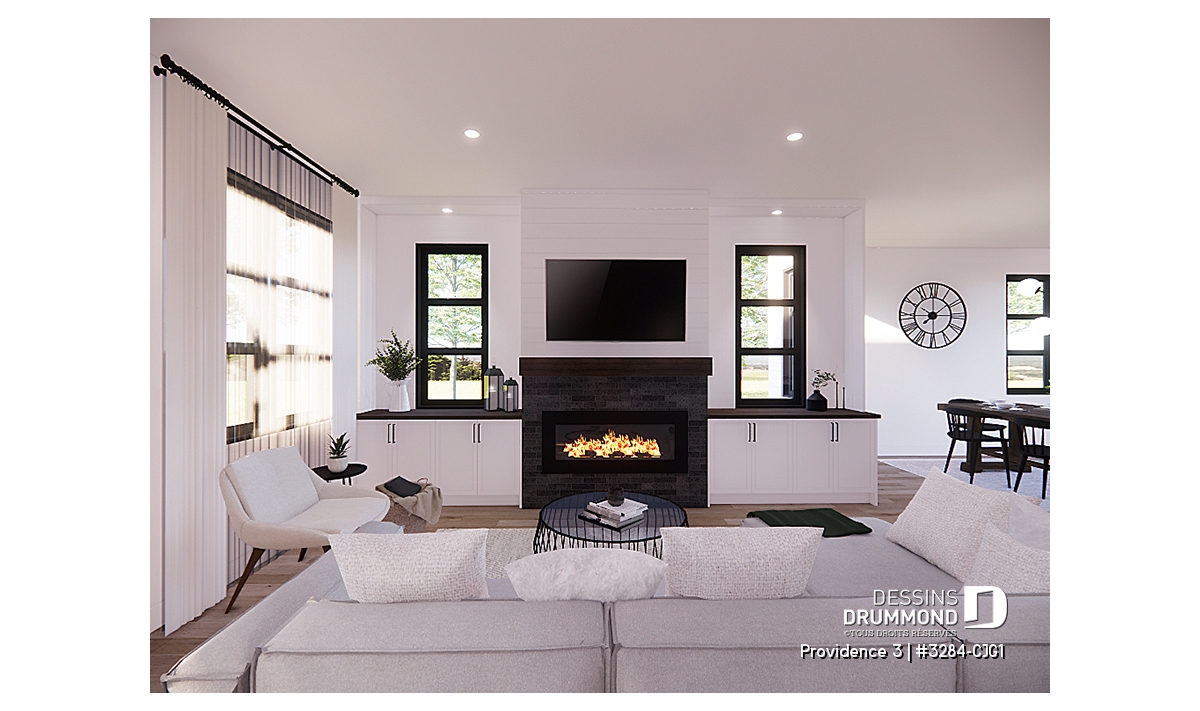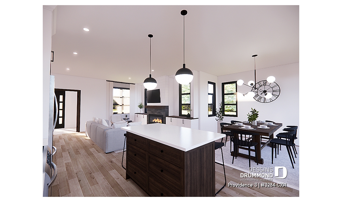 Le cœur de la demeure se dévoile dans son aire de vie ouverte où salon, salle à manger et cuisine se côtoient dans une ambiance conviviale. Le foyer central devient le point focal, créant chaleur et atmosphère, tandis que l’espace permet d’intégrer facilement un coin bureau discret pour le télétravail. La cuisine conviviale impressionne par son grand îlot central, parfait pour cuisiner en famille, recevoir des amis ou superviser les devoirs des enfants. Un garde-manger généreux vient compléter cet espace pensé pour la vie quotidienne.