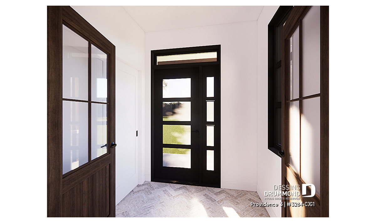 Dès l’arrivée, la galerie avant couverte offre un espace protégé, parfait pour profiter du plein air ou s’abriter par temps de pluie ou de neige. En entrant, un vestibule fonctionnel avec garde-robe intégré permet de bien organiser l’espace et de garder la maison toujours ordonnée.
