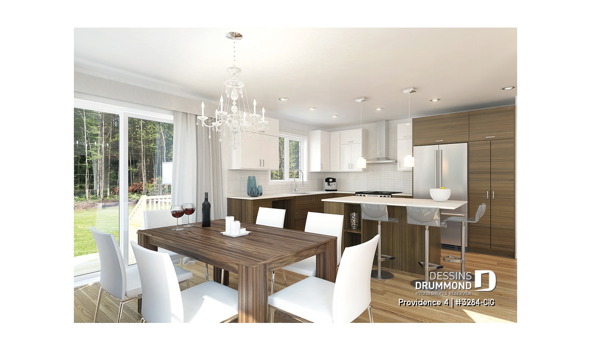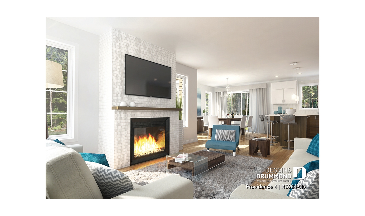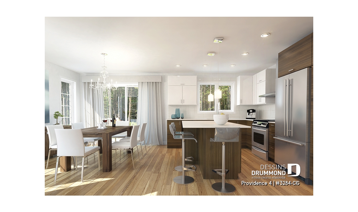 Ce modèle comporte aussi un plancher à aire ouverte à la salle de séjour, salle à dîner et cuisine. Cuisiner et jaser avec ses invités tout en écoutant crépiter le feu à la salle de séjour et sirotant un verre de rouge, c'est toujours tendance! De plus, le grand îlot à la cuisine favorisera la communication avec vos invités ou l’aide aux études tout en préparant le souper! Beaucoup de lumière naturelle dans l’espace salle à dîner et cuisine.
