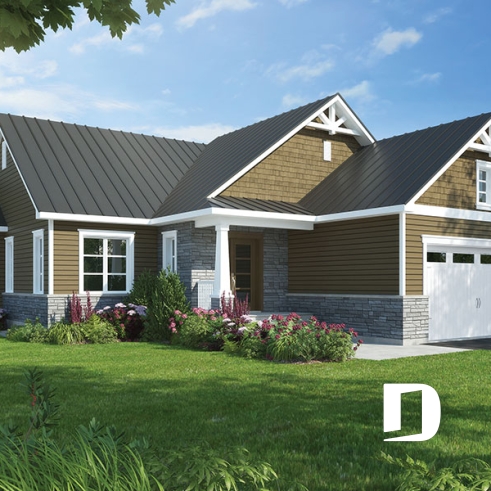 En réponse à une demande croissante pour des modèles d’allure rustique, exposant des poutres de bois décoratives en façade, nous vous proposons ici une version pour terrain étroit du modèle de base de cette nouvelle collection de plans de maison de style Craftsman, offrant 3 chambres. Cette variante propose donc un garage double avec entrée frontale, le tout totalisant 48’ de largeur.