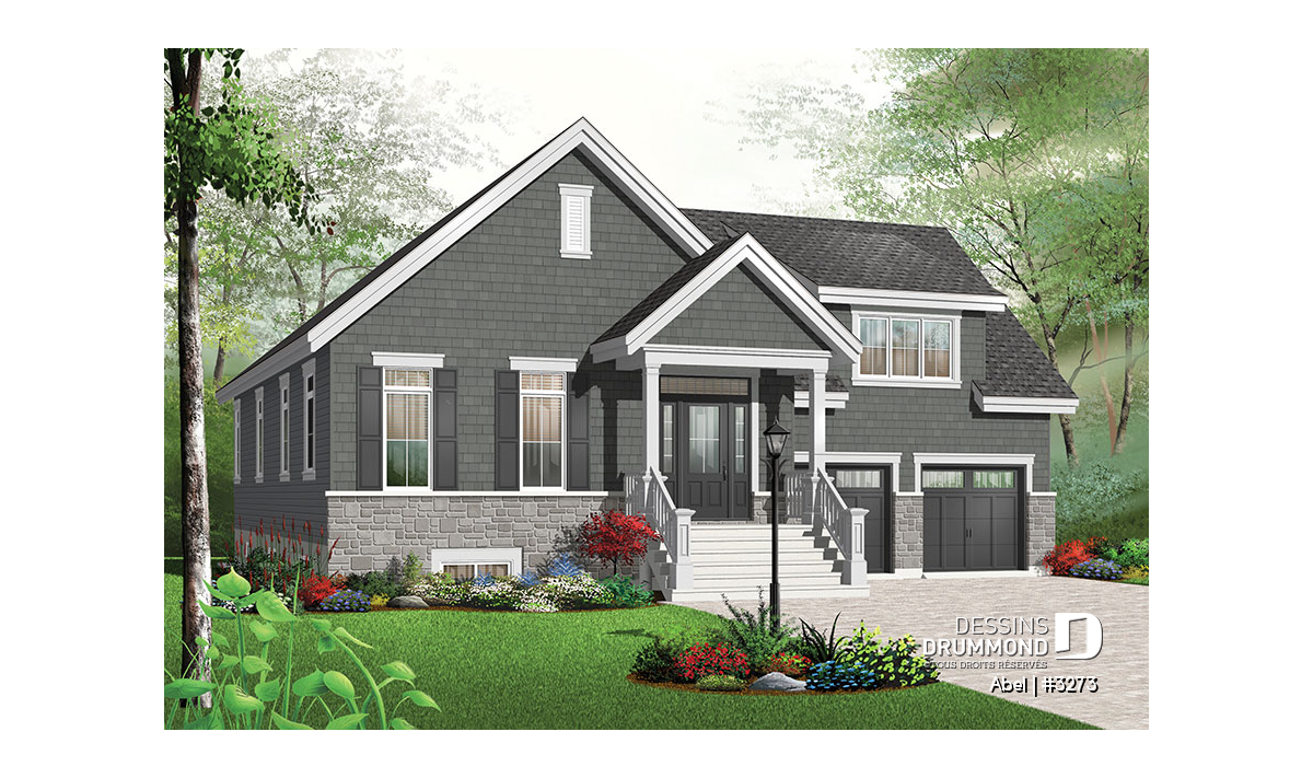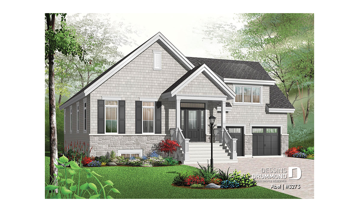 Vue avant - MODÈLE DE BASE - Plan de maison, 3 chambres, garage double avec espace boni, foyer, îlot cuisine, plafond à 9 pieds - Abel