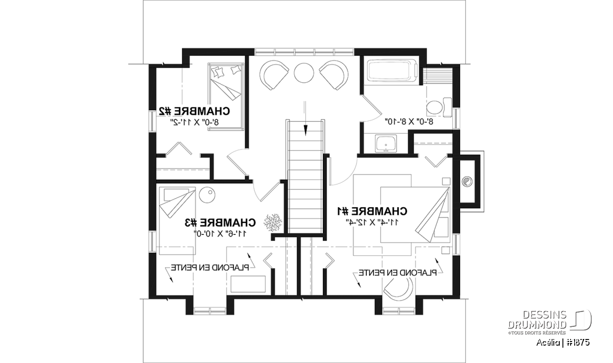 Plan de maison canadienne 3 chambres, avec lucarnes, foyer au salon, buanderie au premier, boudoir