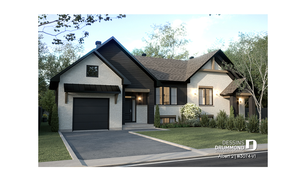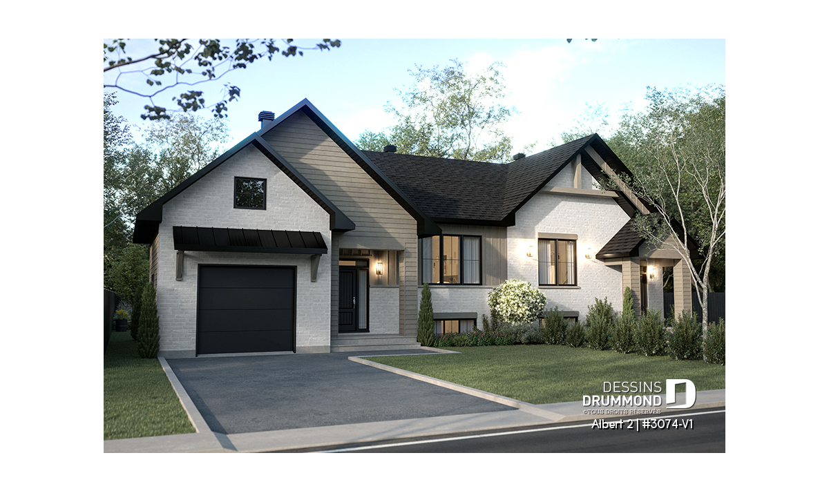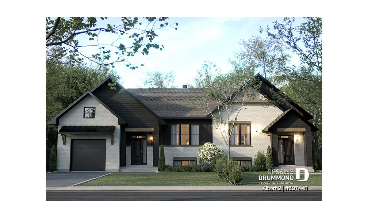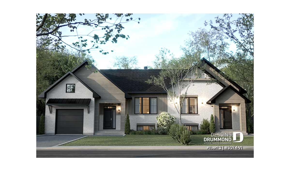 Le plan de maison ALBERT 2 (plan de jumelée #3074-V1) propose un total de 3600 pi.ca. aménagés au rez-de-chaussée et au sous-sol entièrement fini. Chacun des logements comporte donc 1800 pi.ca. aménagés au rez-de-chaussée et sous-sol fini. La grande différence versus son modèle d'origine (ALBERT) réside dans le garage qui a été ajouté à l'unité de droite. Le style moderne et rustique à la fois saura attirer l’œil autant à la campagne que dans les nouveaux quartiers résidentiels! À noter aussi que les deux logements proposent des plafonds à 9' de hauteur au plancher principal.