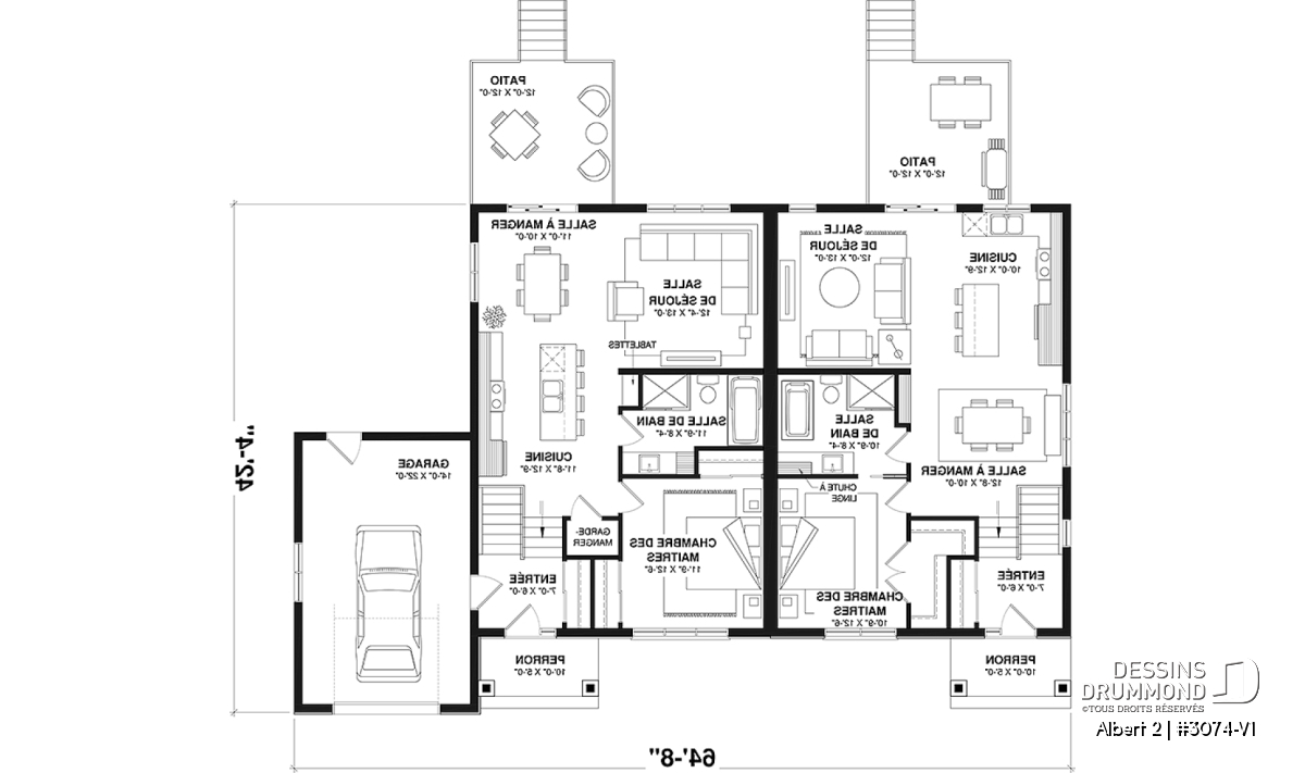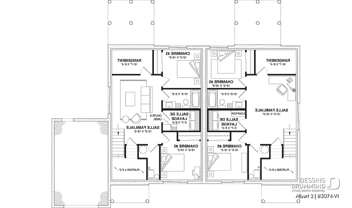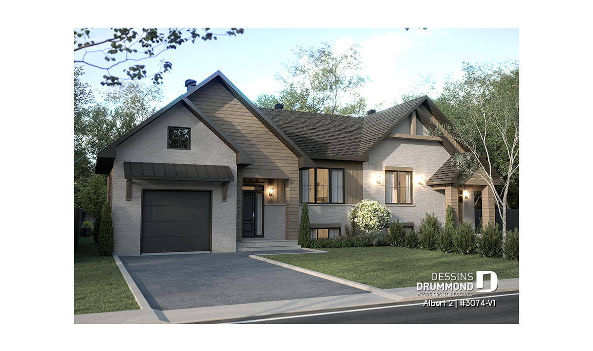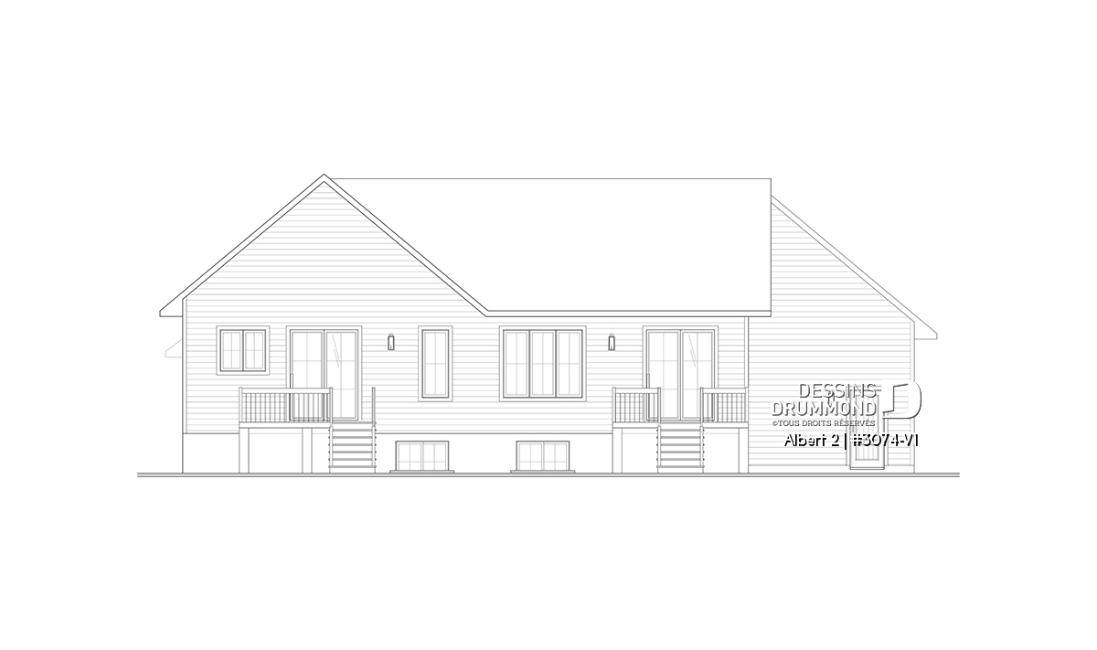 Le plan de maison ALBERT 2 (plan de jumelée #3074-V1) propose un total de 3600 pi.ca. aménagés au rez-de-chaussée et au sous-sol entièrement fini. Chacun des logements comporte donc 1800 pi.ca. aménagés au rez-de-chaussée et sous-sol fini. La grande différence versus son modèle d'origine (ALBERT) réside dans le garage qui a été ajouté à l'unité de droite. Le style moderne et rustique à la fois saura attirer l’œil autant à la campagne que dans les nouveaux quartiers résidentiels! À noter aussi que les deux logements proposent des plafonds à 9' de hauteur au plancher principal.