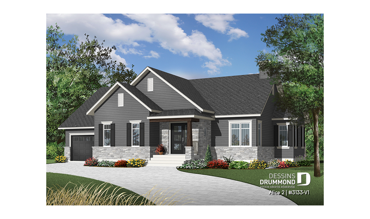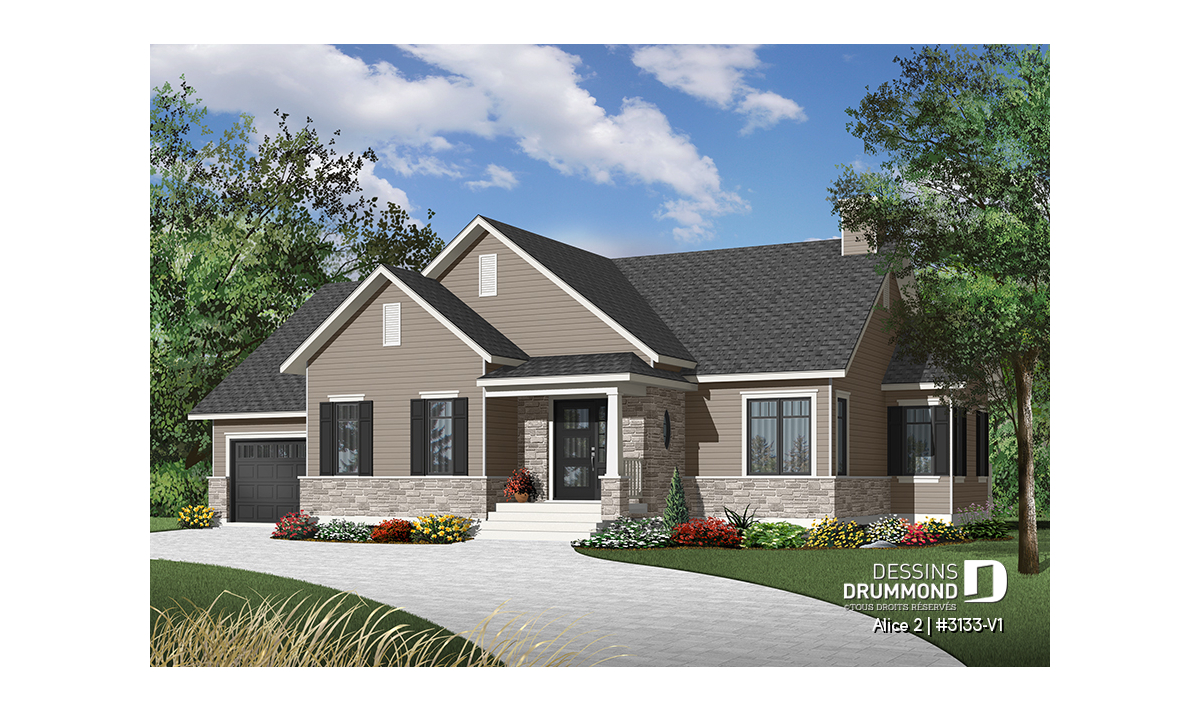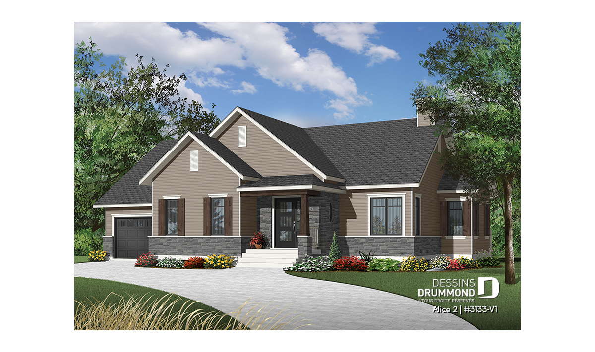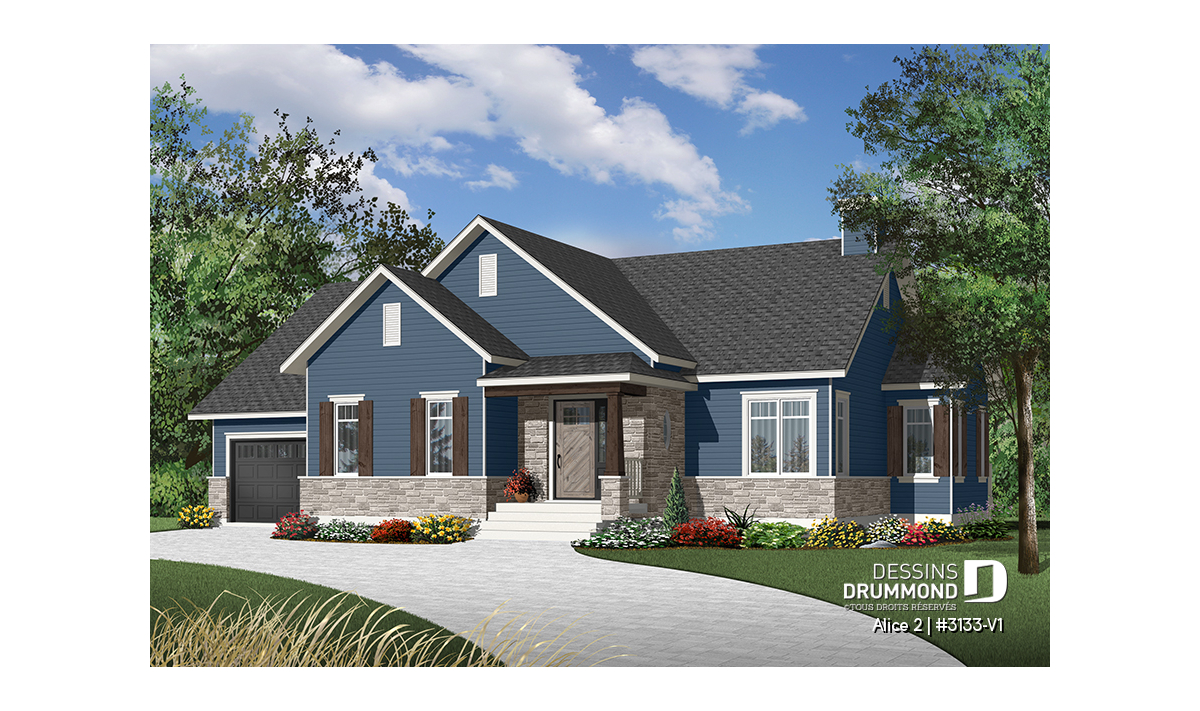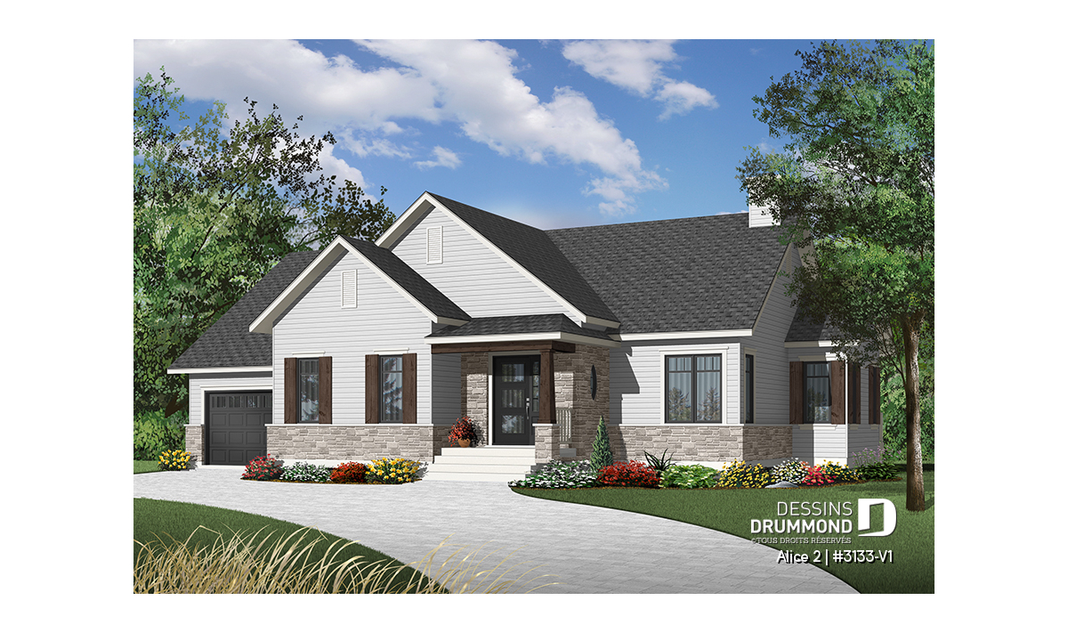 Vue avant - MODÈLE DE BASE - Plan de maison plain-pied 2 chambres, garage, aire ouverte avec foyer 3 faces, grande cuisine - Alice 2
