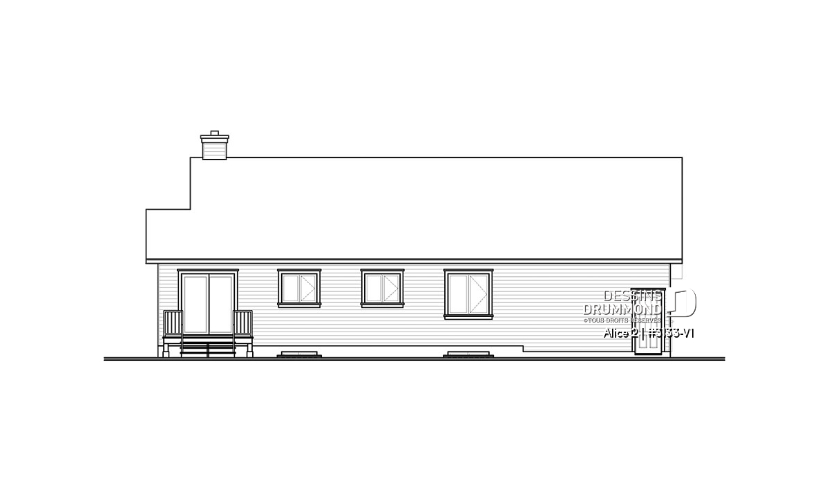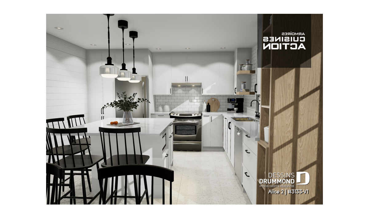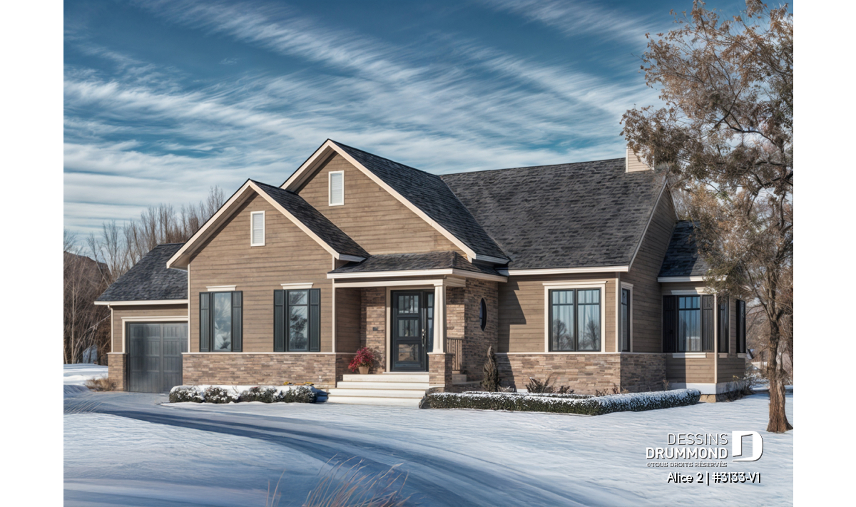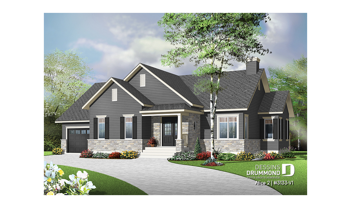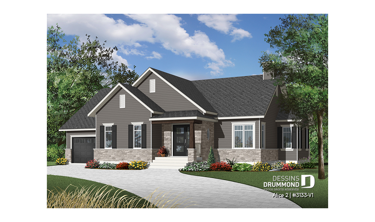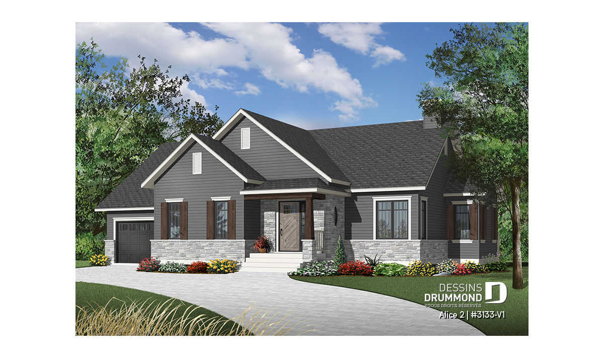 Vue avant - MODÈLE DE BASE - Plan de maison plain-pied 2 chambres, garage, aire ouverte avec foyer 3 faces, grande cuisine - Alice 2