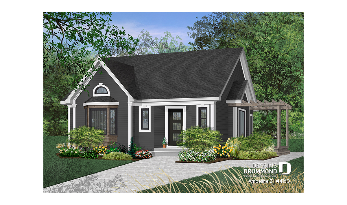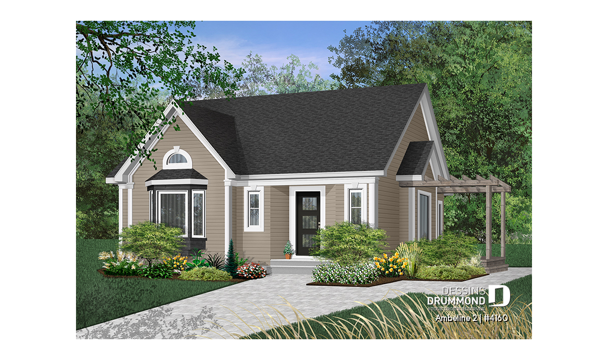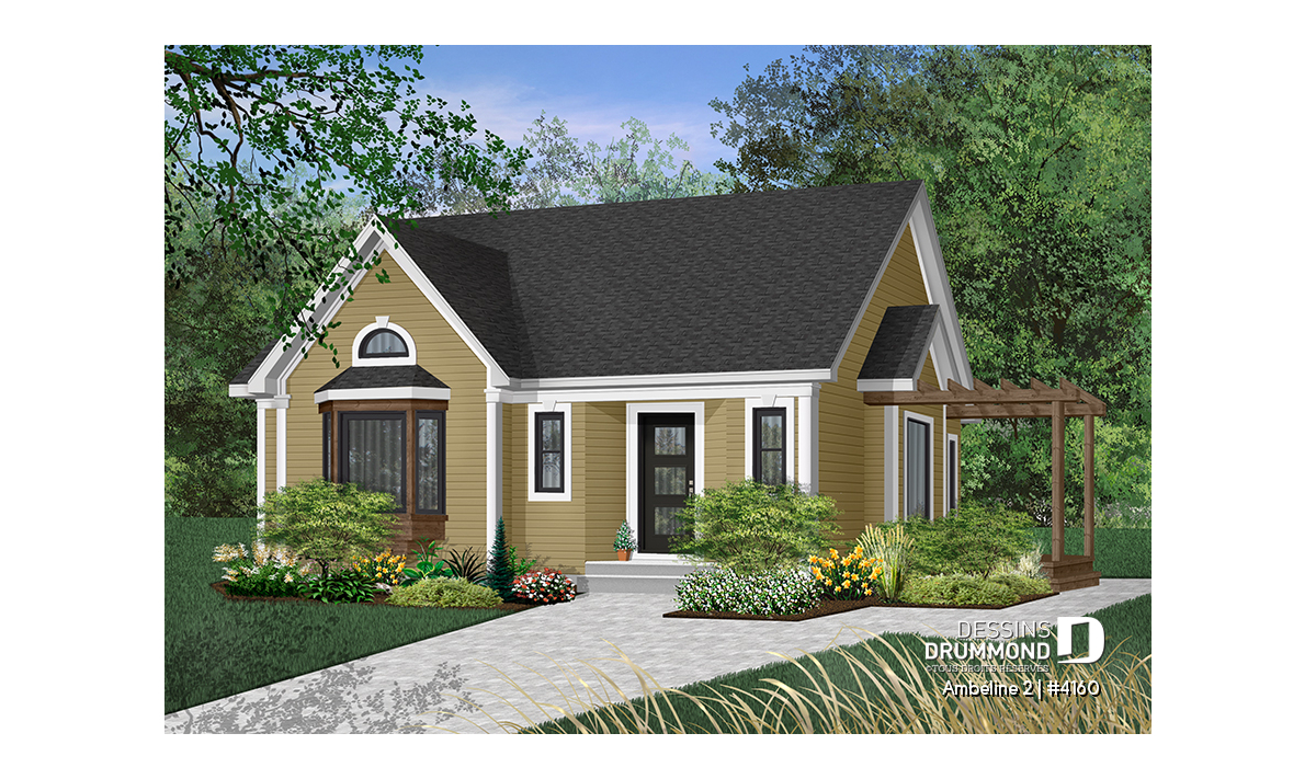 Plan de plain-pied économique de 2 chambres avec s-s aménageable et joli patio avec pergola