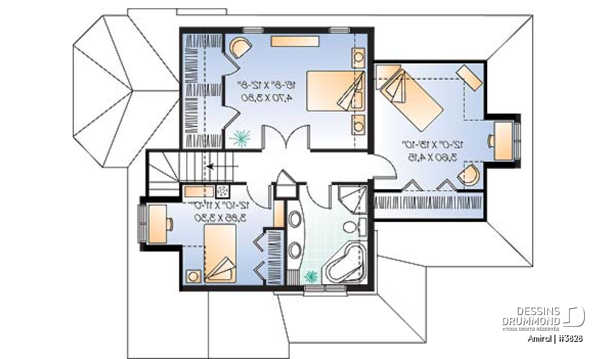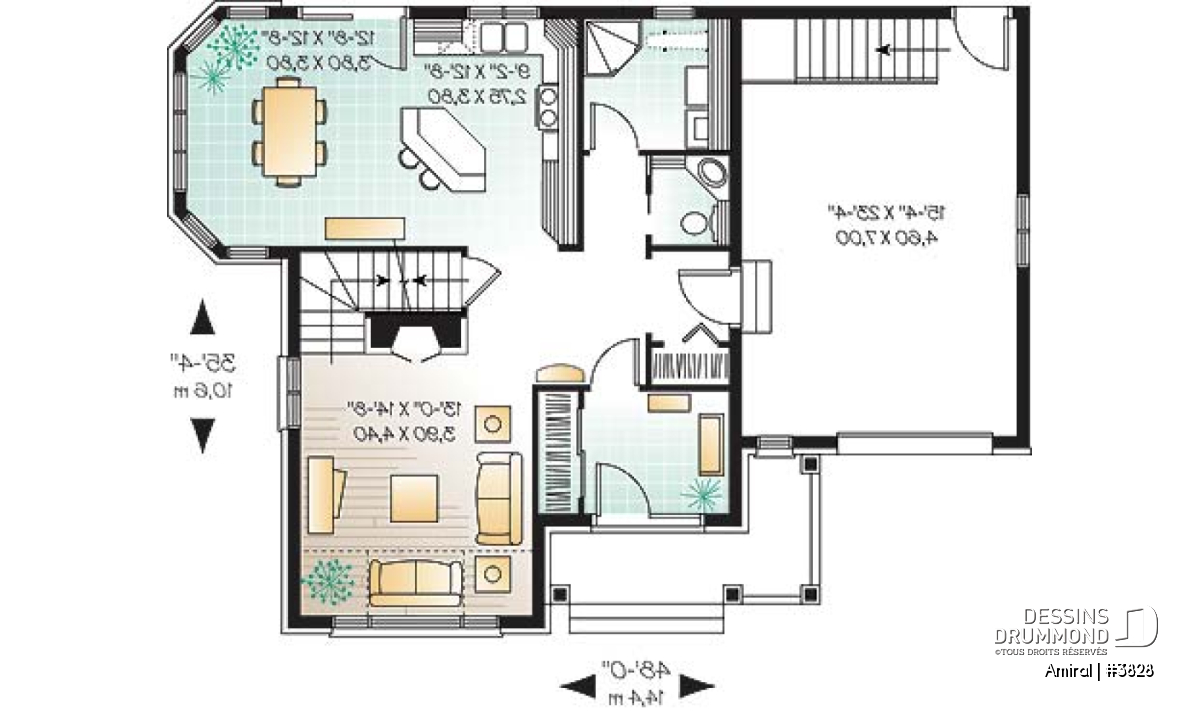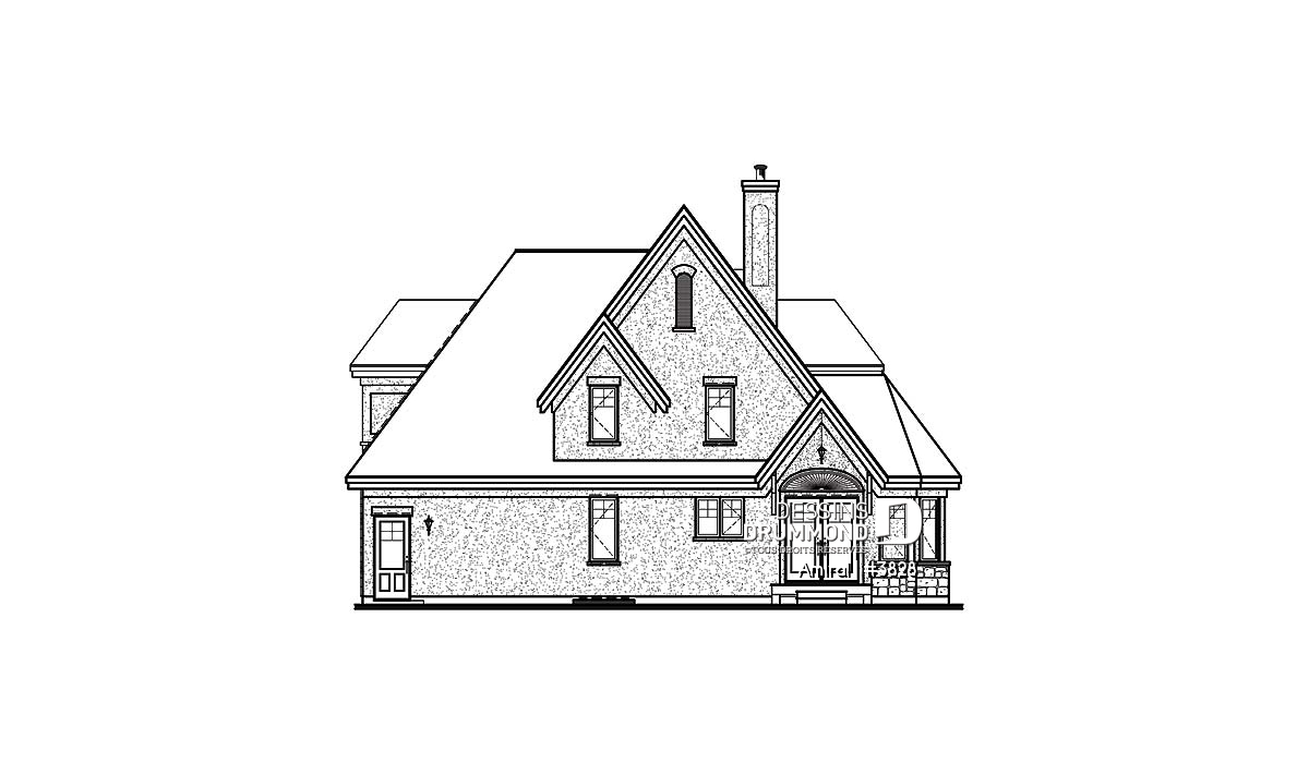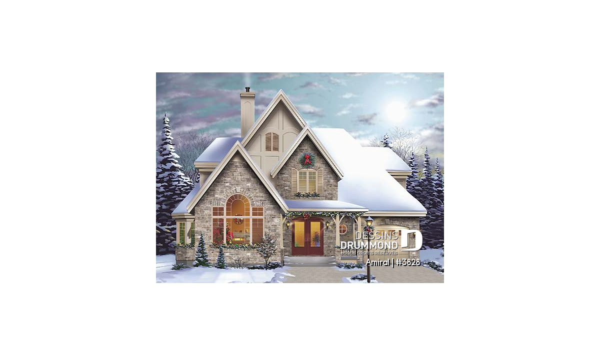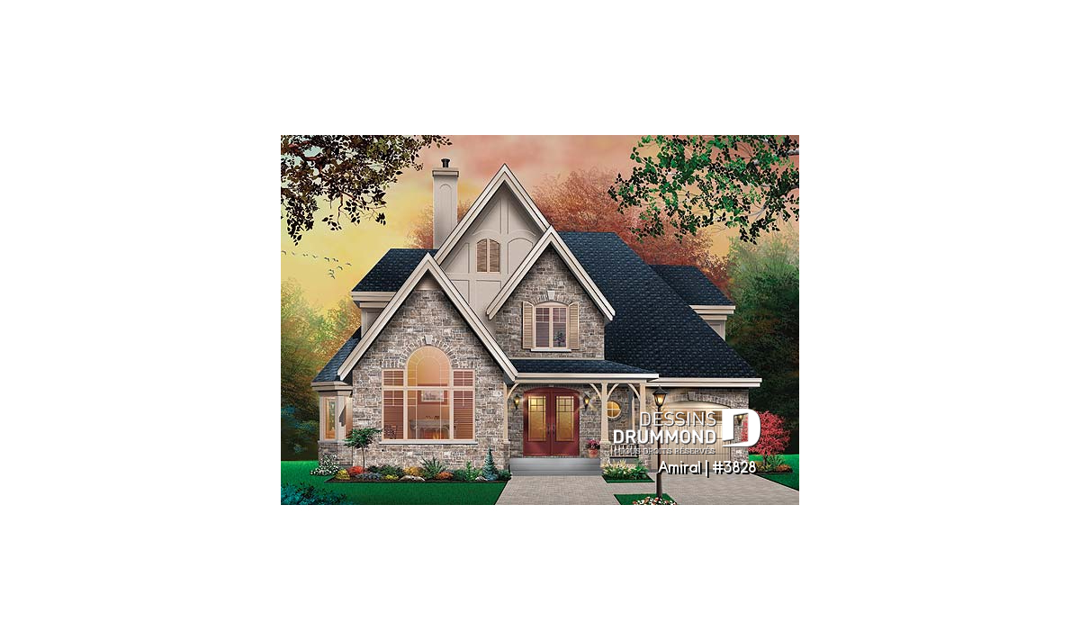 Conçu dans un esprit européen, ce plan 3828 propose donc une brique/pierre en façade principale, et en partie à la base de la façade droite, que le concepteur a pris soin de marier avec un crépi aux autres murs, aux pignons ainsi qu’aux lucarnes afin d’obtenir le cachet européen recherché. Le garage, fort bien intégré à l’ensemble, inclus un escalier vers le sous-sol et suggère au-dessus une chambre avec lucarne et excellent rangement.