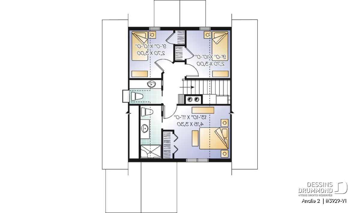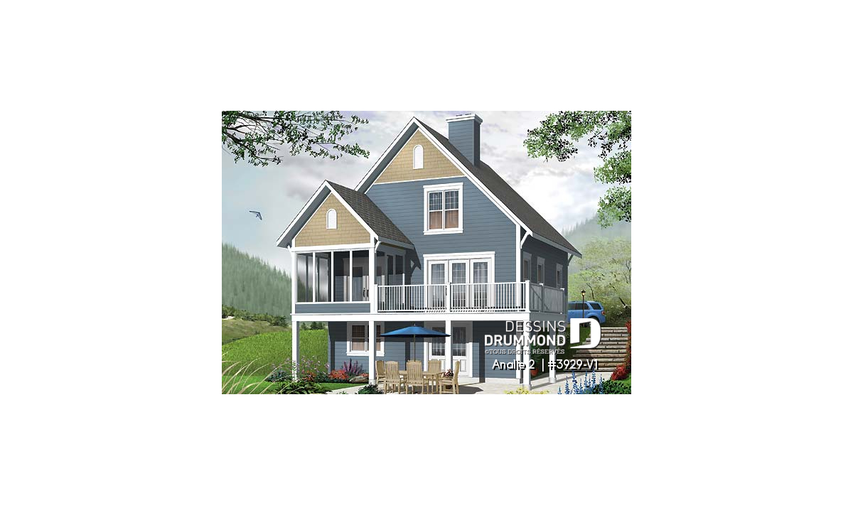 À l’intérieur, et tout comme pour le modèle 3929 dont il origine, on apprécie la présence d’un vestibule à l’entrée de service, la localisation d’un coin buanderie au rez-de-chaussée et le maintien d’un secteur activités ( cuisine/dînette/salle à manger et salle de séjour ) entièrement ouvert et tout en lumière grâce à une abondante fenestration répartie sur trois façades. Ici s’ajoute un foyer et des portes-jardin à la salle de séjour ainsi qu’une douche au coin toilette/buanderie.