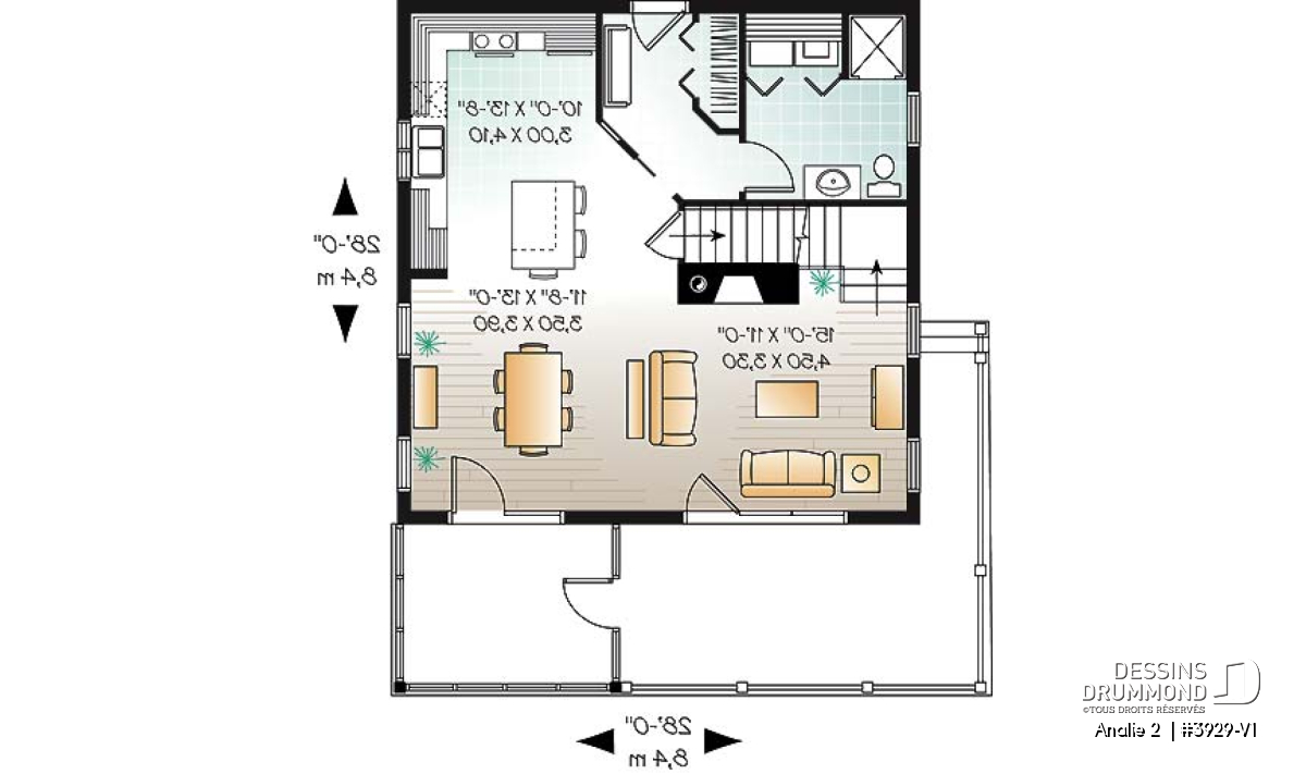 Conçu à partir du modèle 3929, que vous êtes en mesure de voir en photos dans notre galerie photos, ce modèle suggère le même carré de maison, 28’ x 28’, avec un aménagement intérieur ajusté en fonction d’une entrée de service relocalisée.