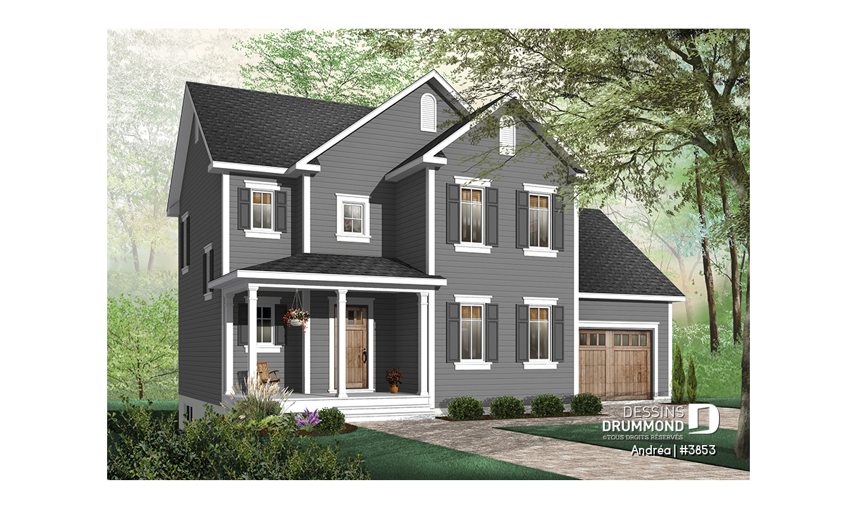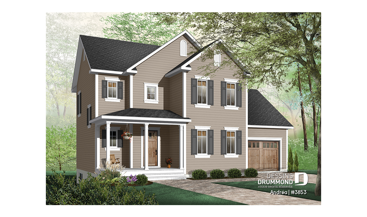 Version couleur no. 2 - Vue avant - Plan de maison à étage avec garage, 3 chambre, vestibule, grande cuisine, buanderie au r-d-c - Andréa