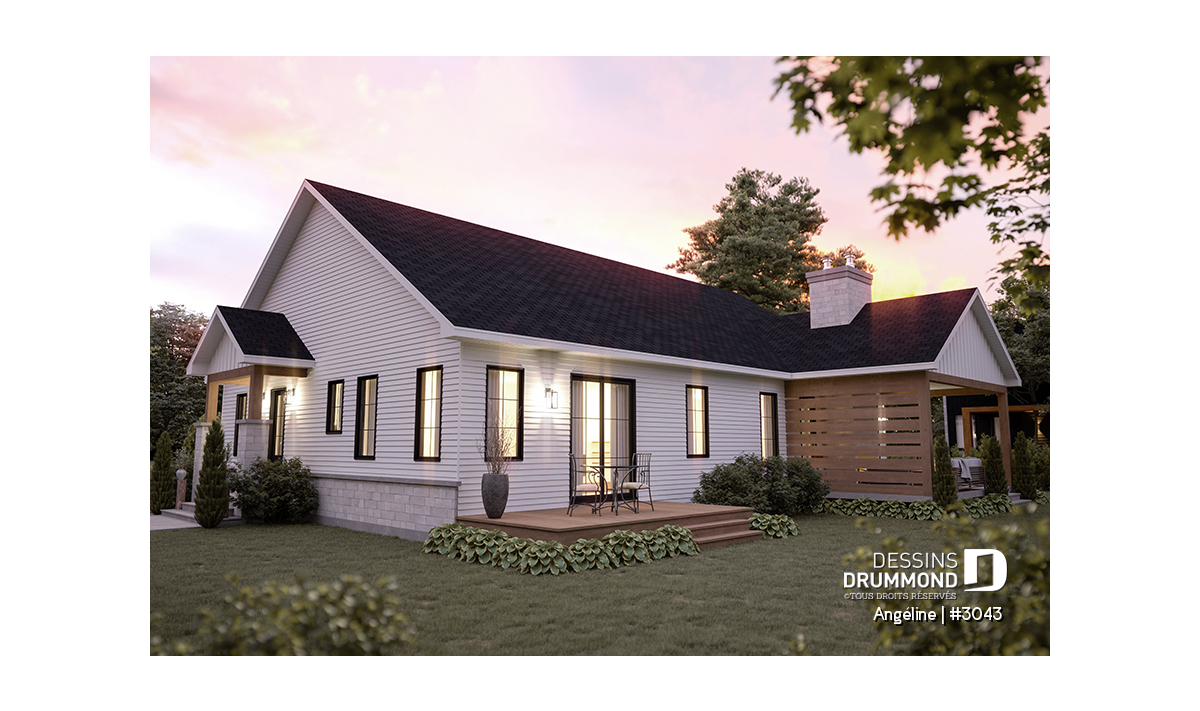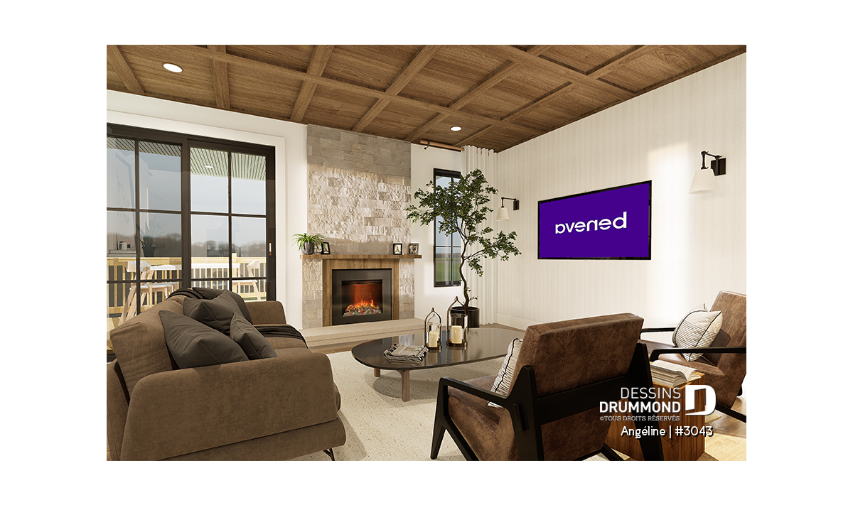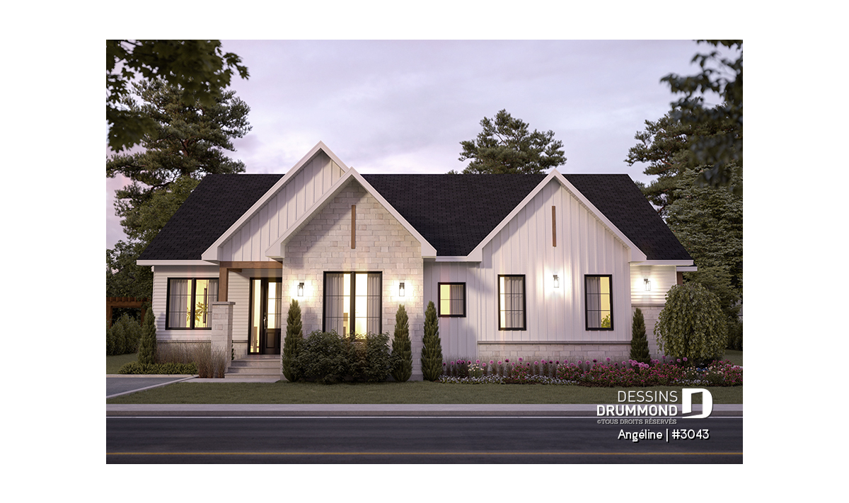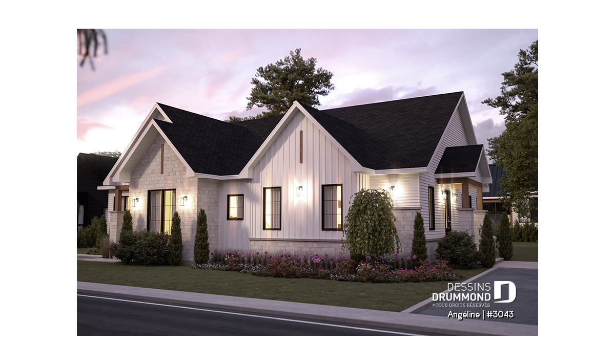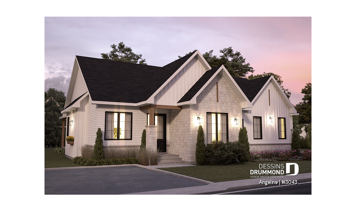 Le plan ANGÉLINE (#3043) avec son look extérieur attrayant offre des espaces de vie remarquables, notamment une suite parentale, une terrasse abritée avec foyer, un salon magnifique avec une cheminée du côté familial, ainsi qu'une cuisine avec îlot et garde-manger. Chaque modèle comprend des chambres spacieuses, une salle de lavage communicante au rez-de-chaussée et des salles de bains fonctionnelles, dont une privée à la chambre des parents au logement principal.