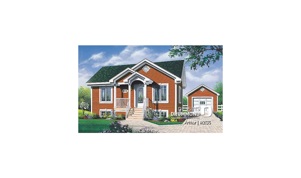 Plan de plain-pied abordable, 2 chambres, cuisine avec comptoir-lunch, galerie avant