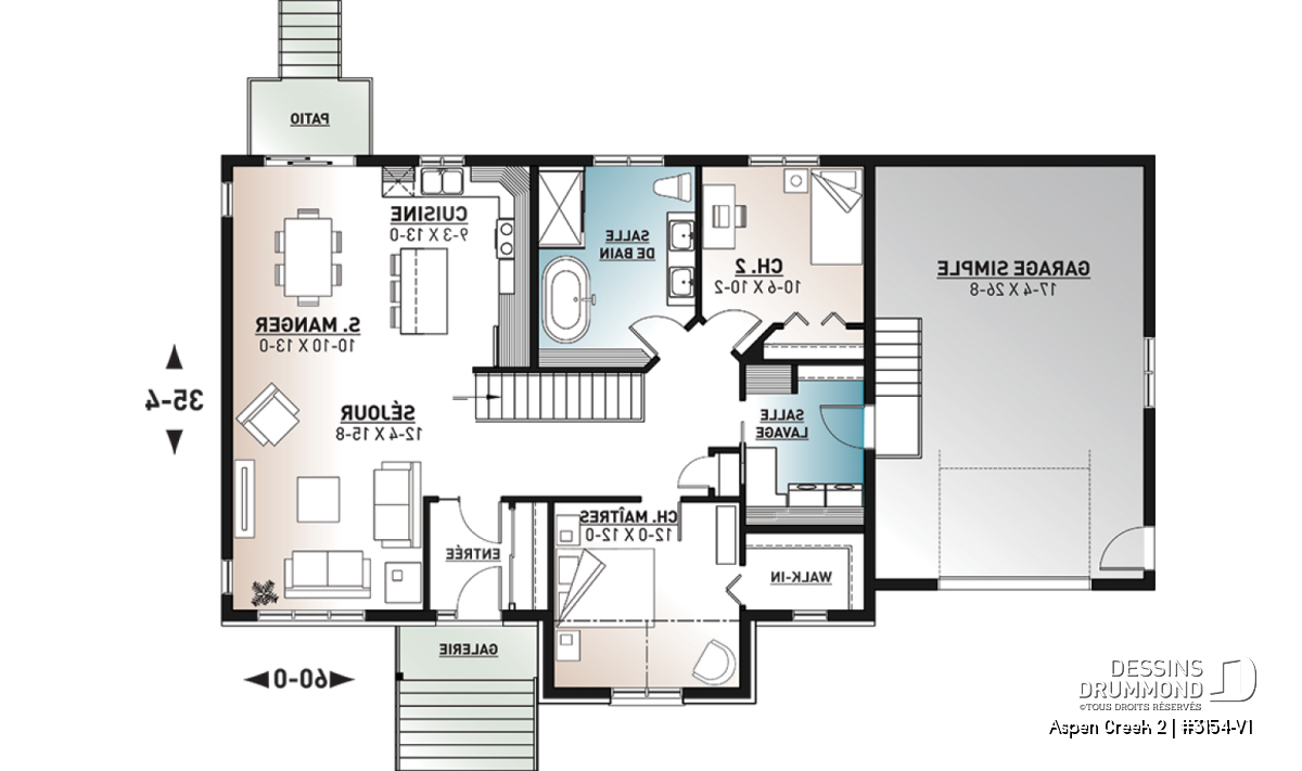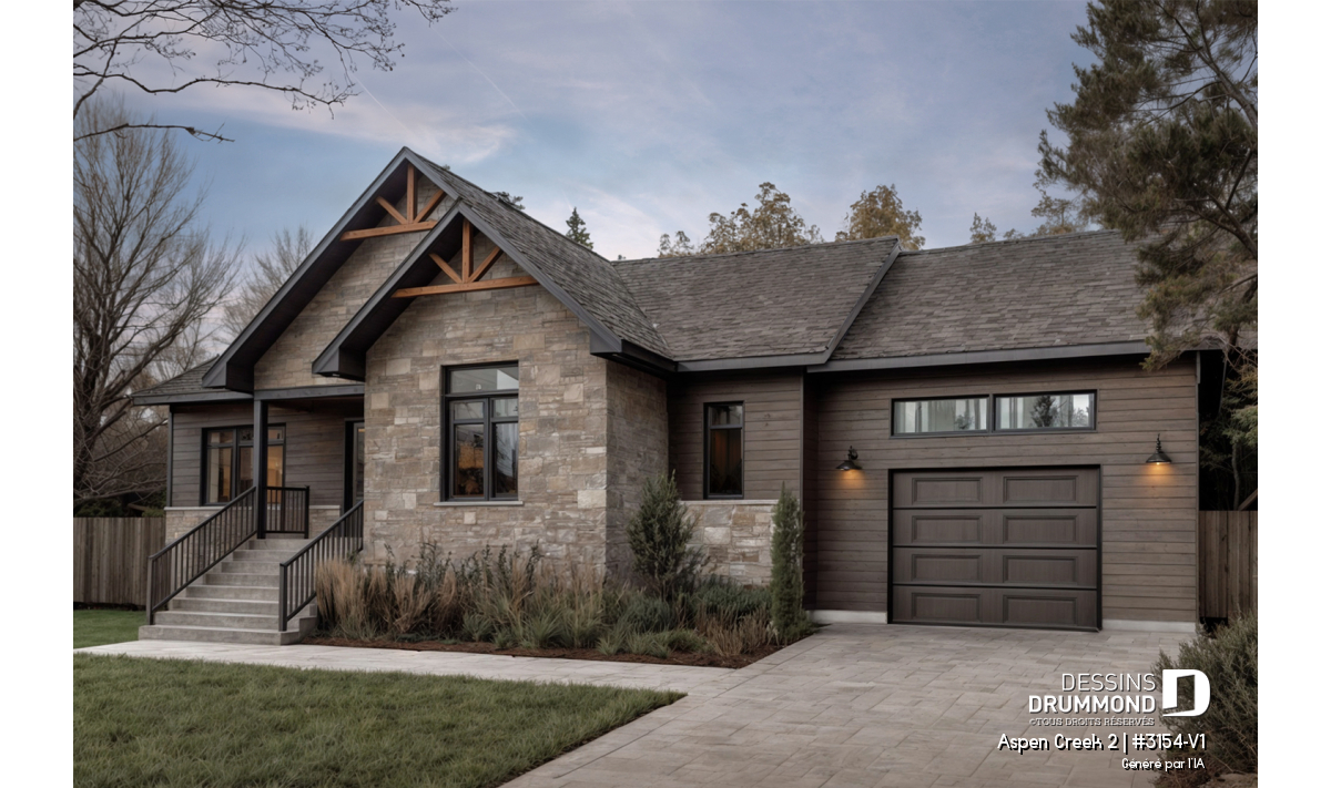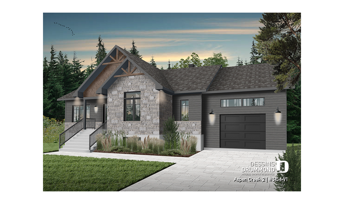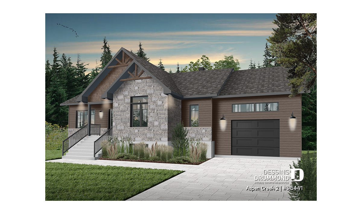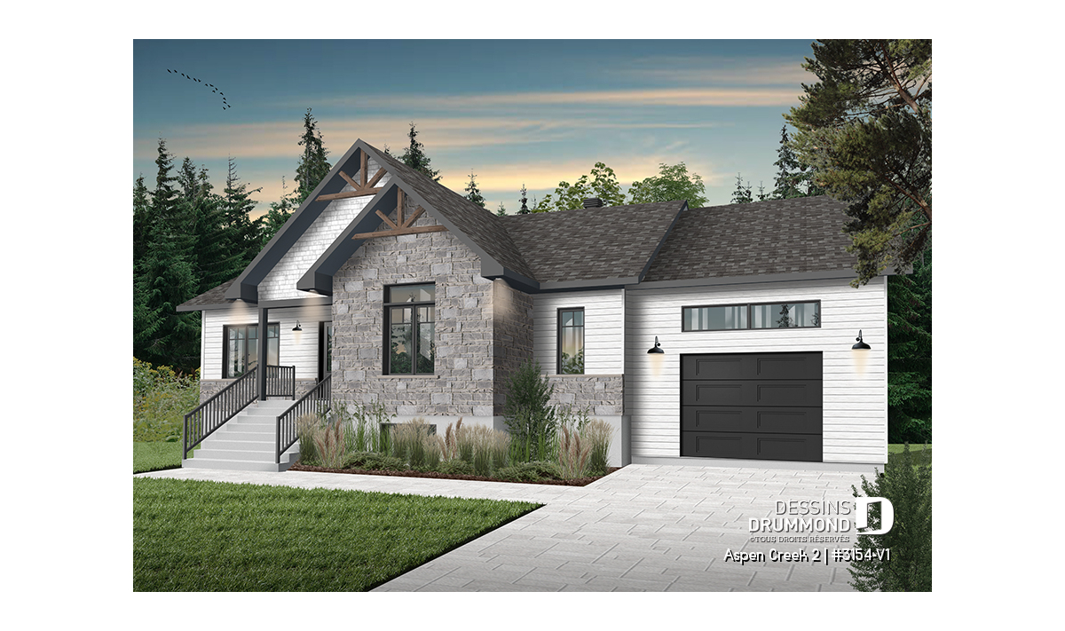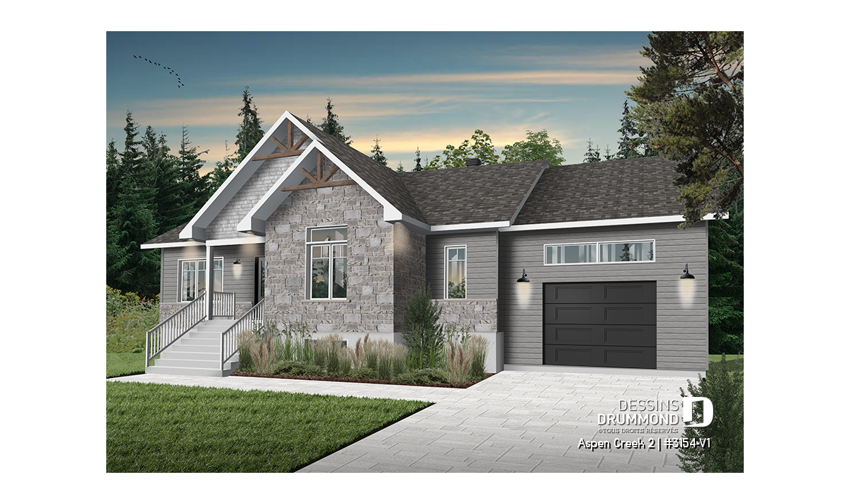 Le plan de maison plain-pied, 2 chambres et garage, de style champêtre suivant, Aspen Creek 2 (3154-V1), nous propose un espace habitable de 1 344 pieds carrés, dans lesquels plusieurs étapes de vie peuvent s’y adapter.
