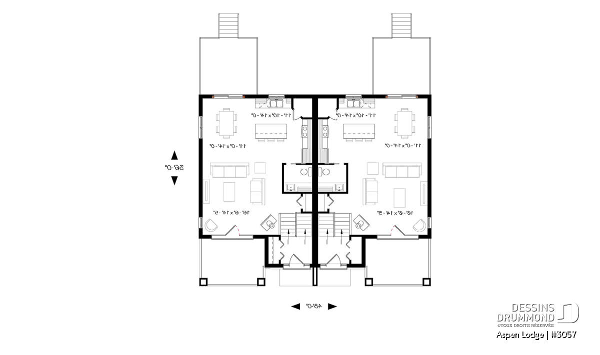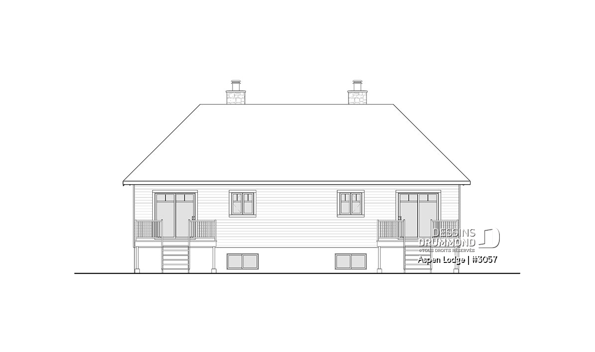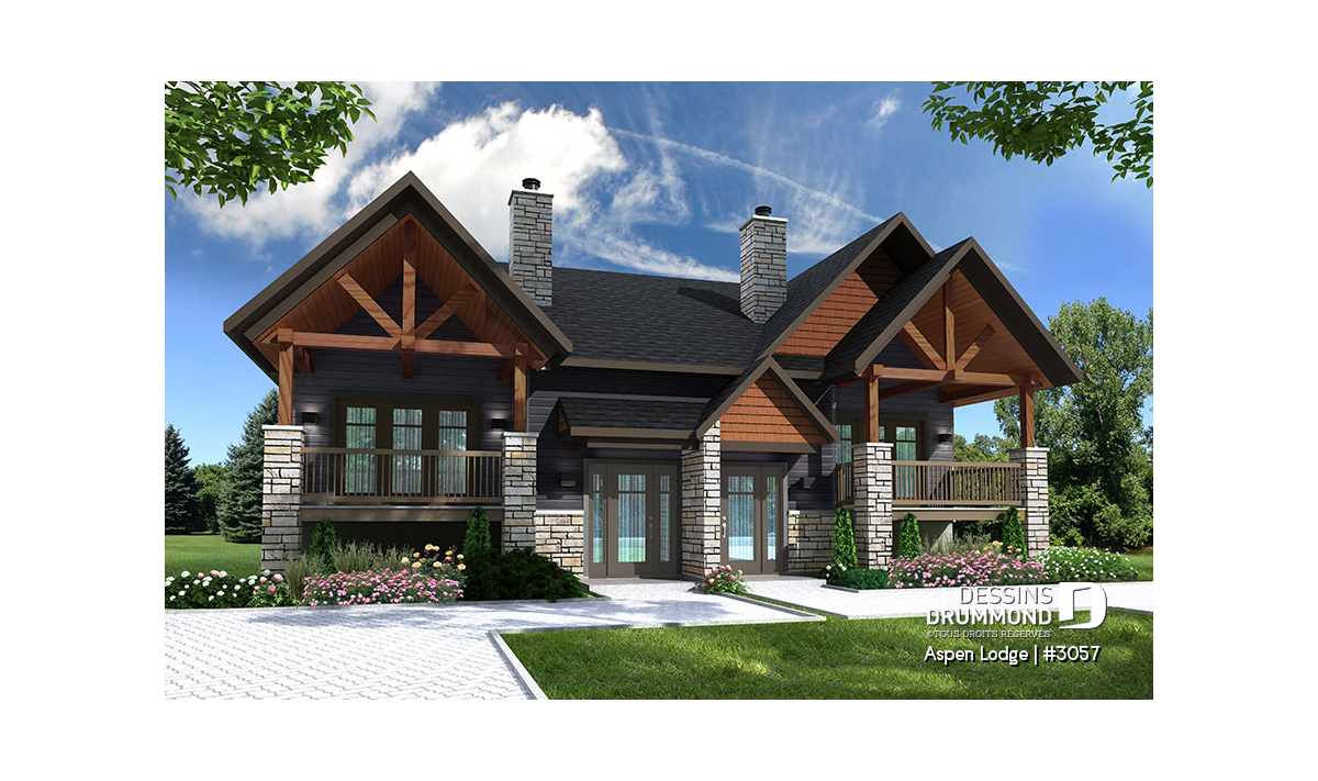L'élément qui attire d'abord notre attention est incontestablement les magnifiques balcons avant abrités, permettant ainsi aux occupants de venir admirer le paysage en sirotant un cocktail ou café du matin, à l’abri des intempéries. Le nouveau plan de maison jumelée no. 3057, aussi nommé Aspen Lodge de Dessins Drummond, propose un aménagement intérieur des plus audacieux de par la localisation de ses 3 chambres (par unité).