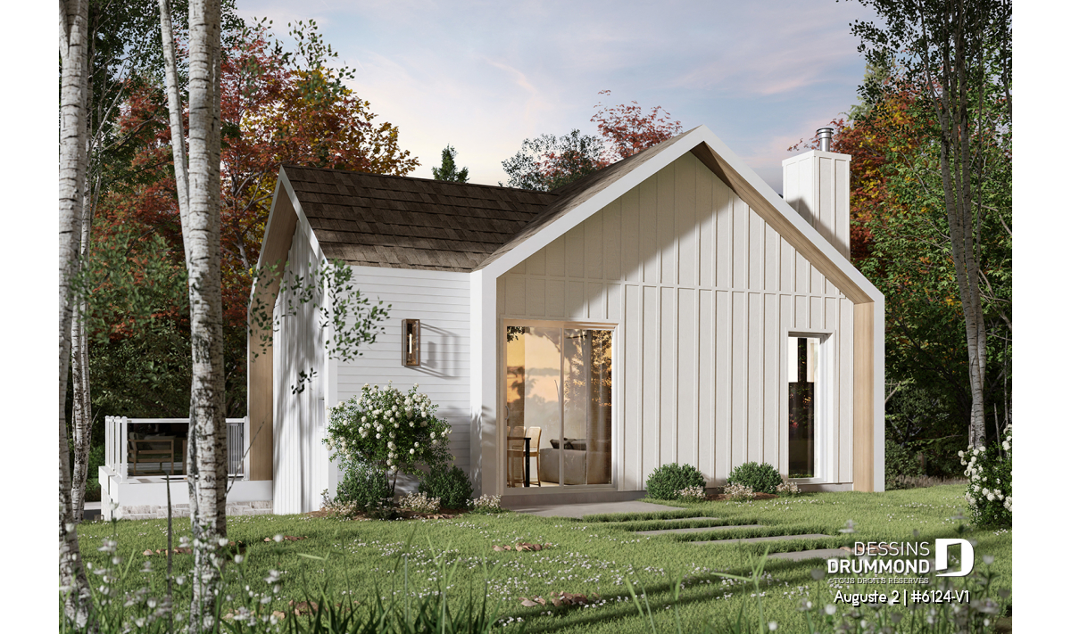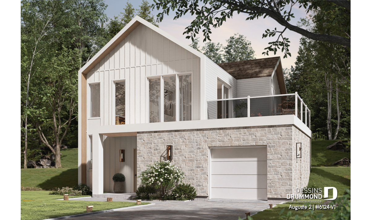 Vue avant - MODÈLE DE BASE - Plan de maison moderne scandinave, planchers inversés, 3 chambres au rez-de-chaussée et aire commune à l'étage - Auguste 2