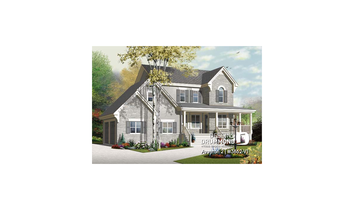Plan de maison de campagne à étage, 3 chambres, 2.5 salles de bain, garage double