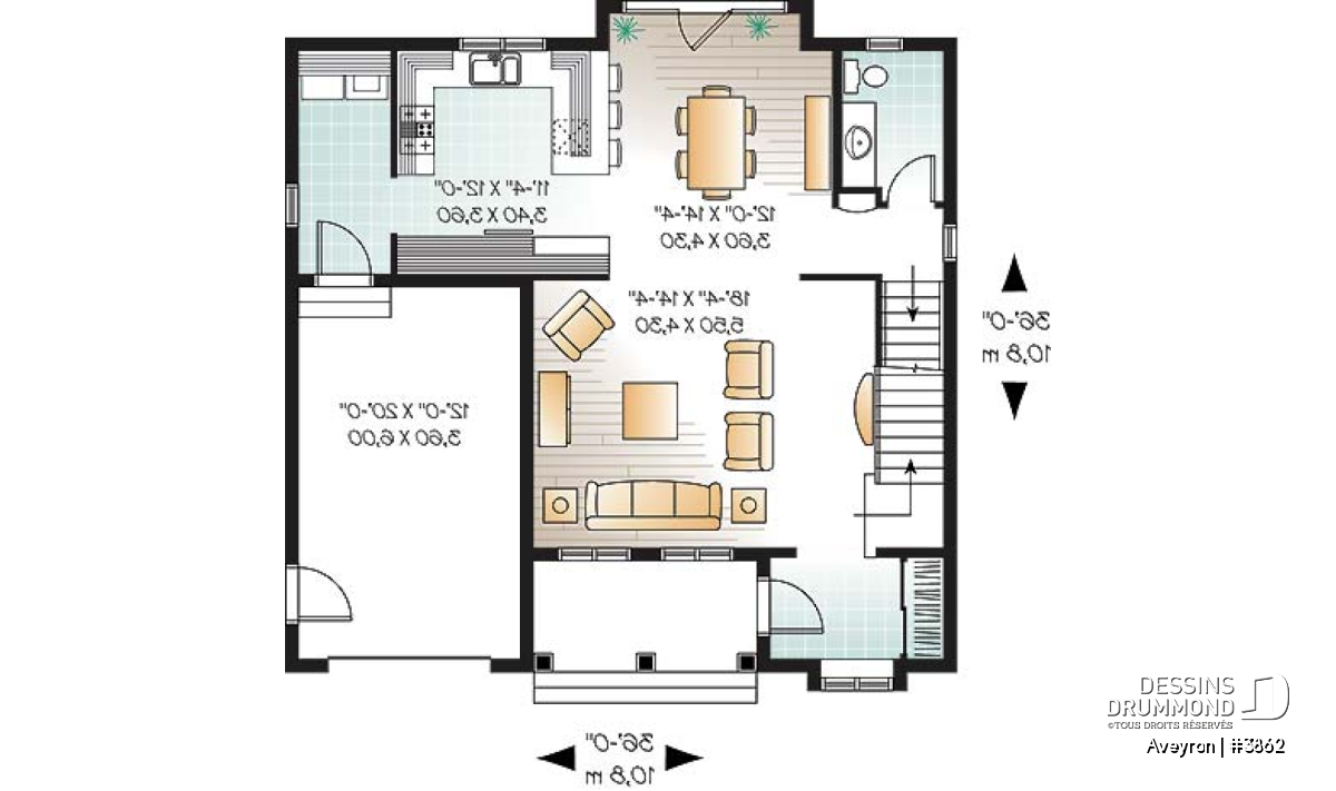 Ainsi, à l’extérieur, on retrouve un perron couvert assurant un accès plus intime à l’entrée principale agrémentée d’une entrée, genre vestibule avec fenêtre en saillie, et un garage avec porte tout à fait dans le ton de la maison. Les volumes sont à la fois simples et élégants et permettent un aménagement intérieur tout en confort. Entrons donc sans plus tarder !