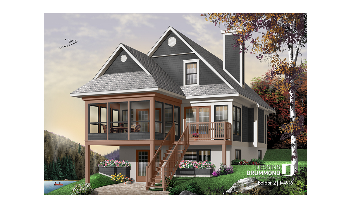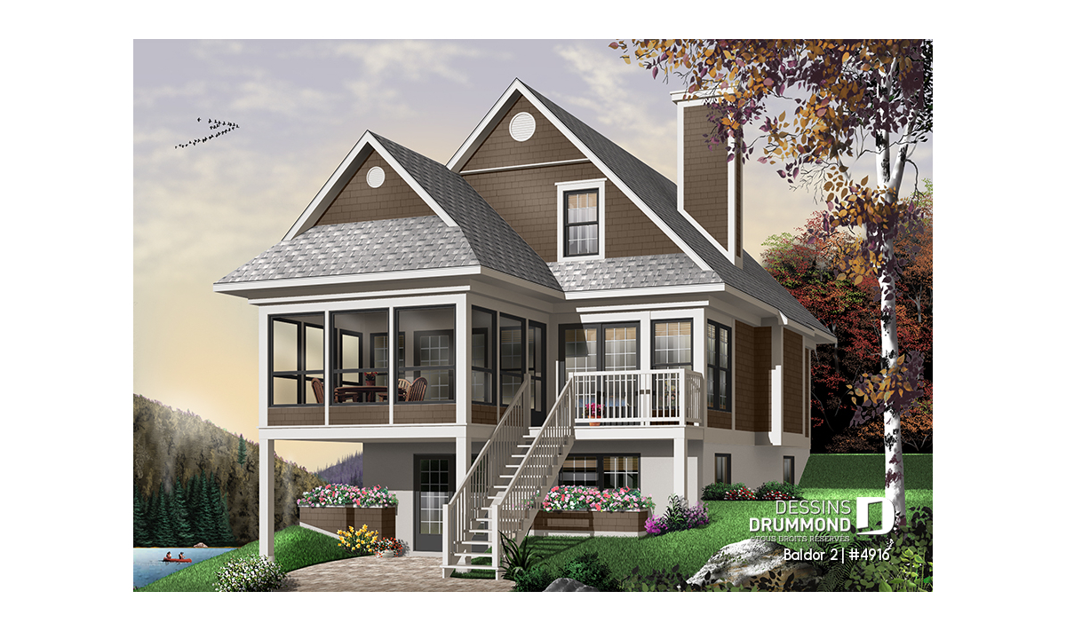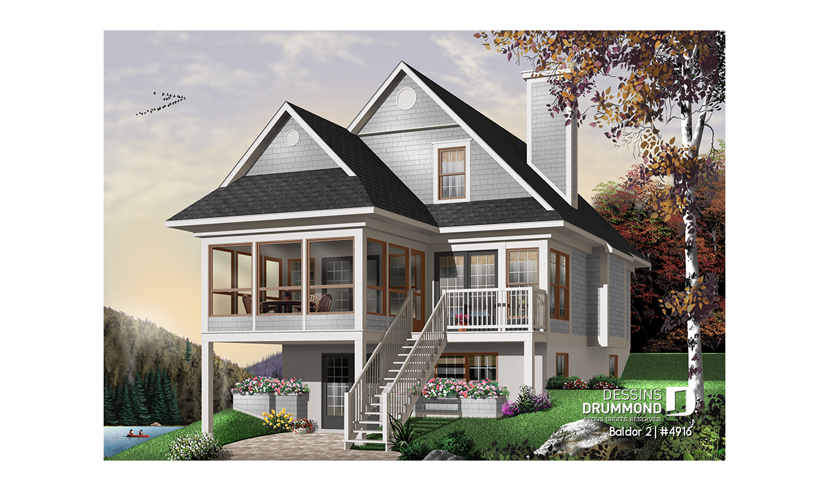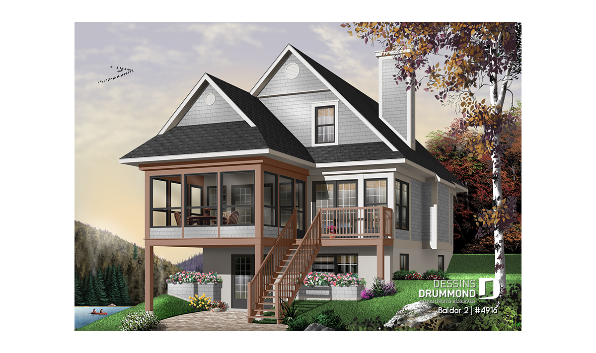 Vue arrière - MODÈLE DE BASE - Plan de chalet ou maison avec vue panoramique, 3 chambres, foyer, abri moustiquaire, parents au premier - Baldor 2