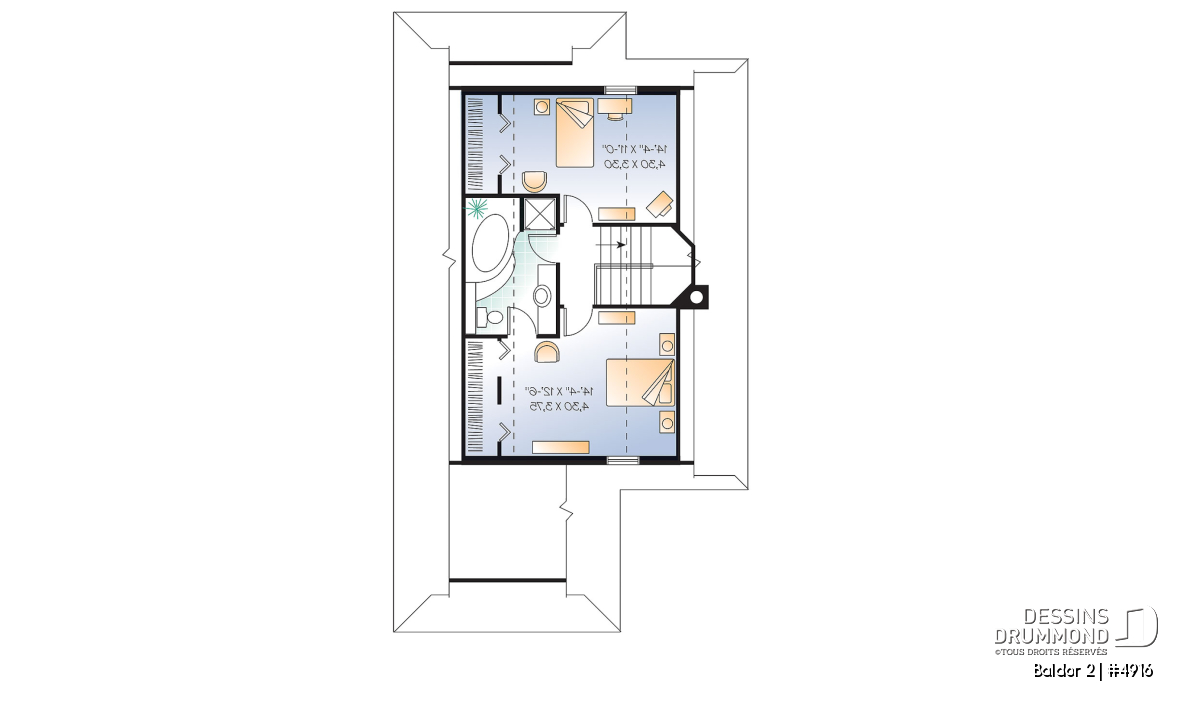 Étage - Plan de chalet ou maison avec vue panoramique, 3 chambres, foyer, abri moustiquaire, parents au premier - Baldor 2