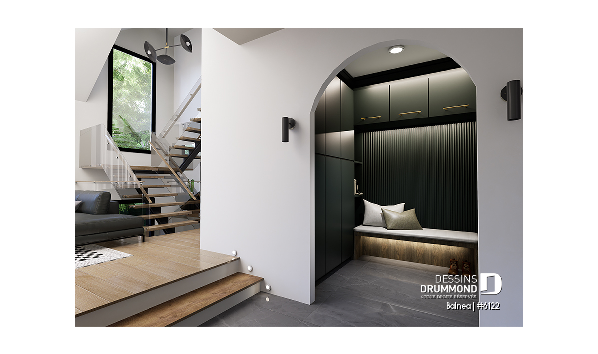 Cette maison d’inspiration scandinave avec pierre en façade (partielle) combine chaleur, authenticité et design moderne. Son extérieur noble et intemporel s’harmonise parfaitement avec son aménagement intérieur lumineux et spacieux. Dès l’entrée, vous êtes accueilli par une grande entrée avant au plafond de 10'4", créant une impression de grandeur et de convivialité. L’entrée avant et du garage mènent directement à un vaste vestiaire avec banquette intégrée, pratique pour déposer manteaux et chaussures au quotidien et garder la maison ordonnée. Une petite salle d’eau, judicieusement placée près du salon, offre confort et commodité à vos invités.