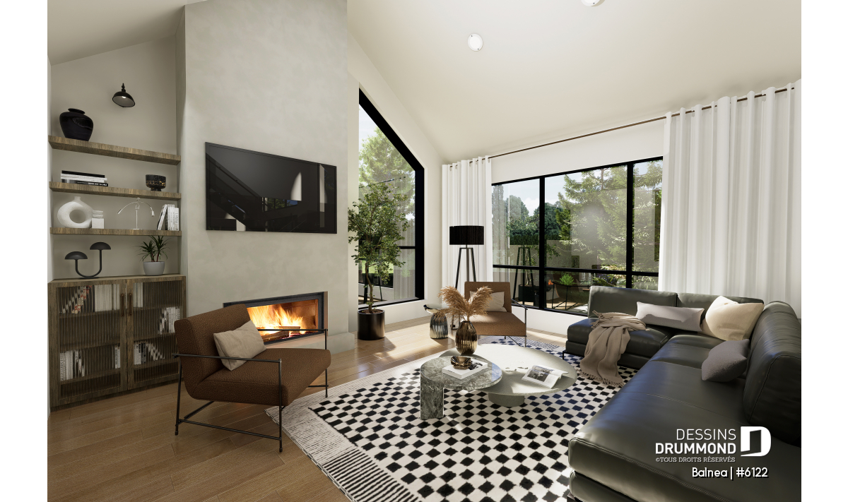 La grande salle familiale est mis en valeur par un plafond cathédrale de 16' et une atmosphère ouverte qui se prolonge dans la salle à manger qui elle aussi propose un plafond cathédral de 18' de hauteur. Au centre du salon, en façade de la maison, trône un superbe foyer, visible depuis la salle à manger et le salon. Le foyer à bois STÛV s21 proposé devient la pièce maîtresse de l’aire de vie : son design élégant et sa performance apportent chaleur, style et ambiance scandinave, transformant chaque moment en expérience cocooning et raffinée.