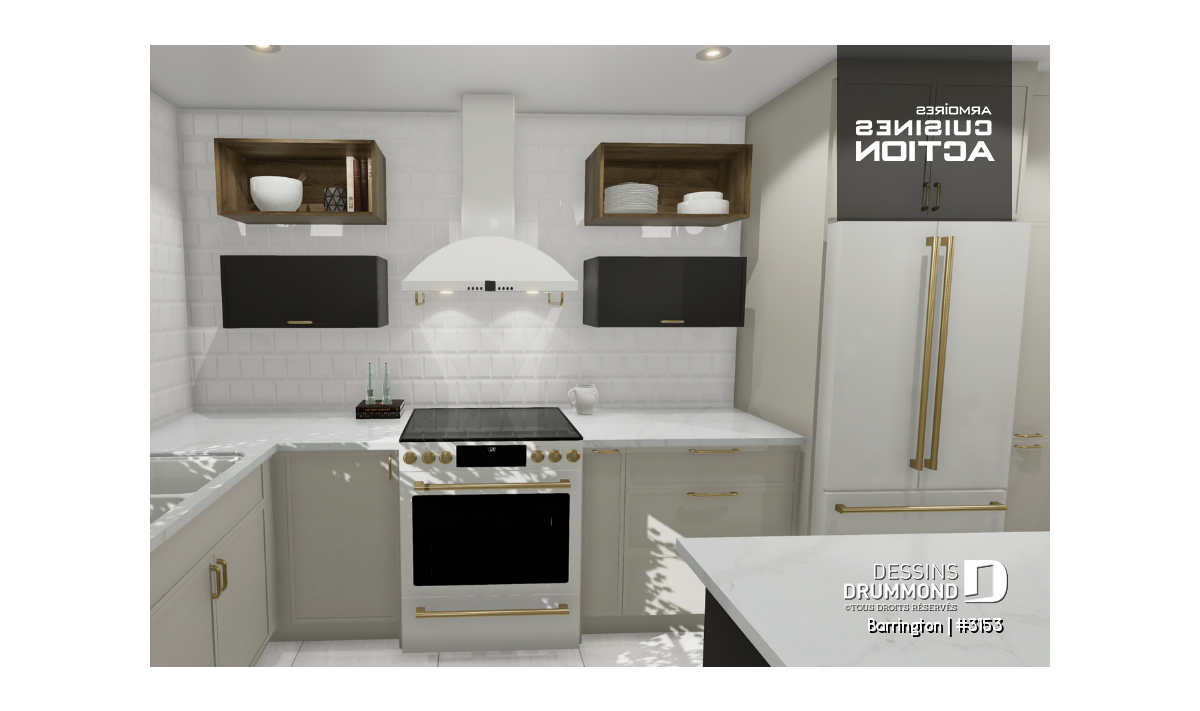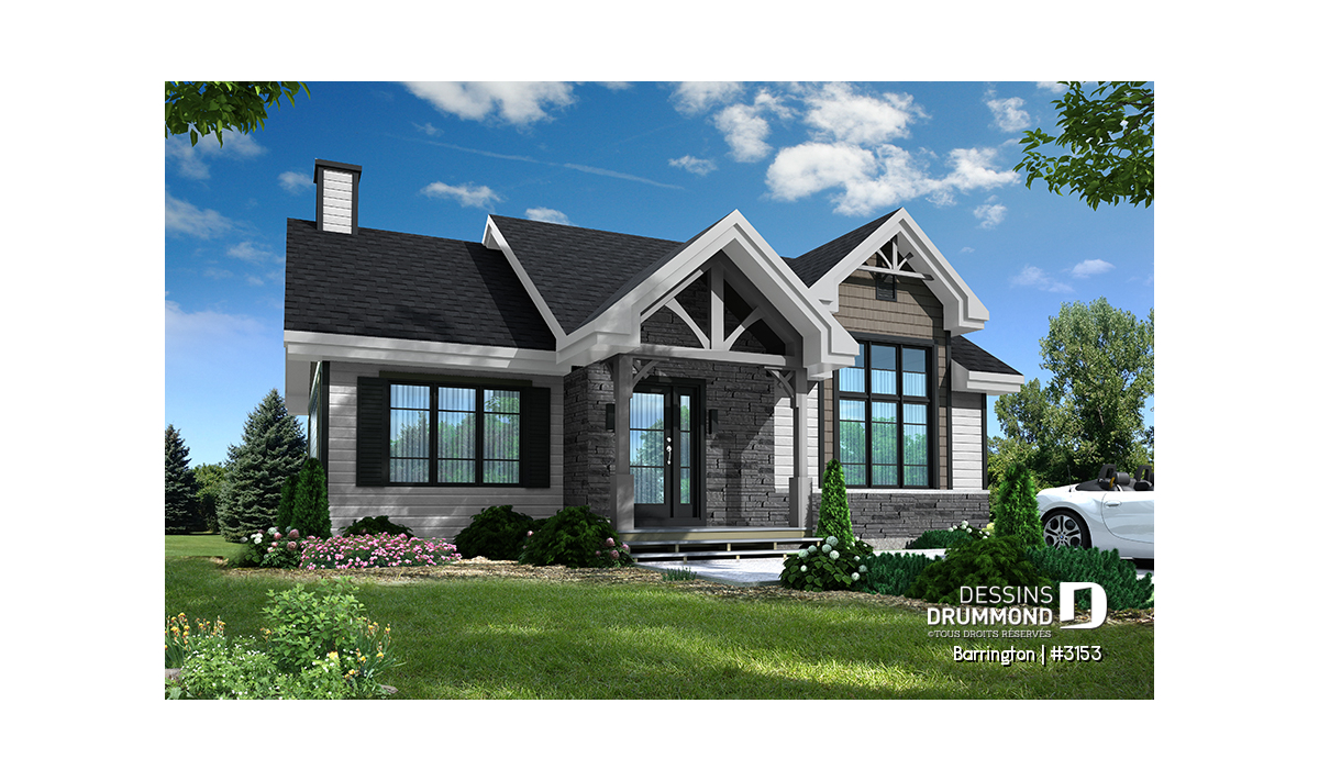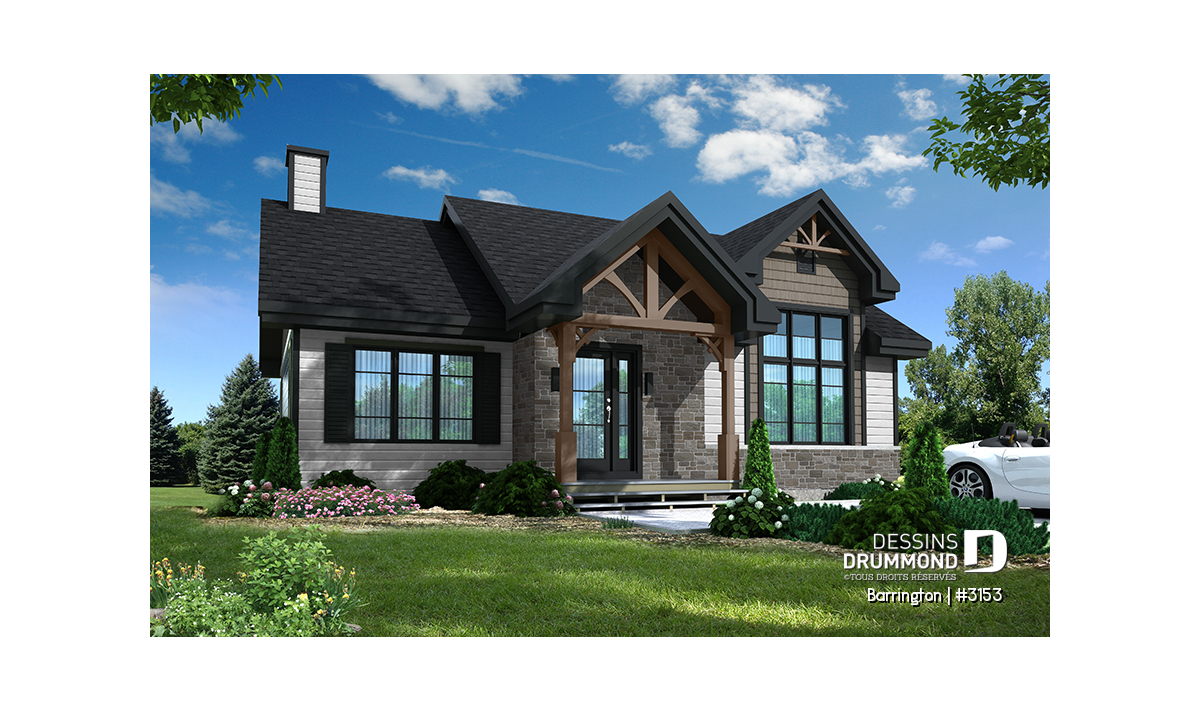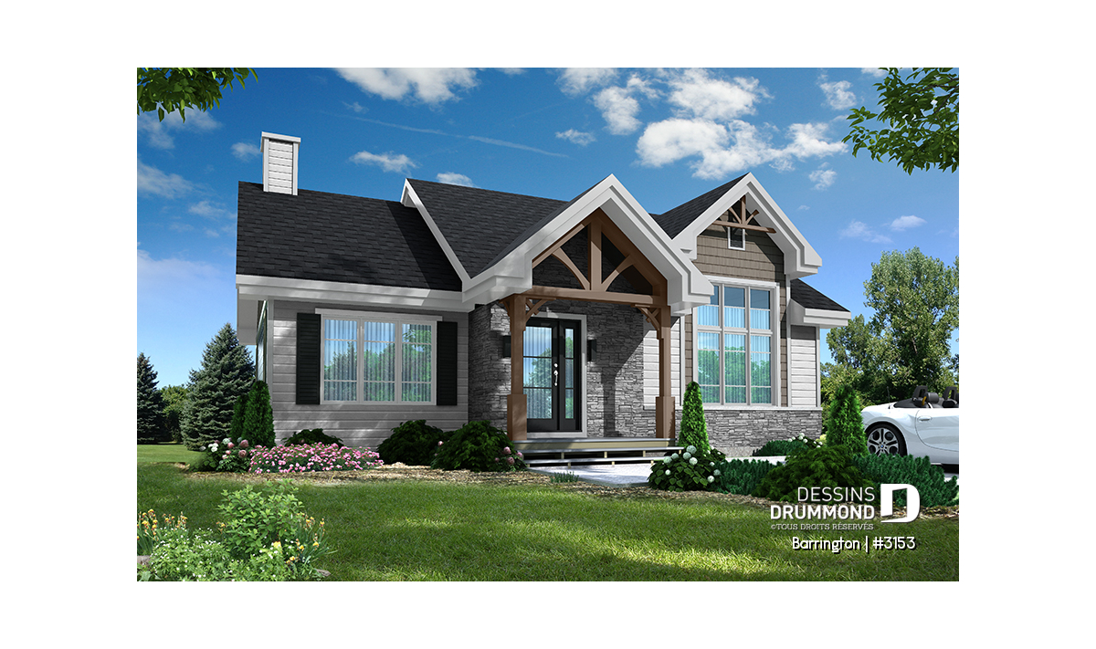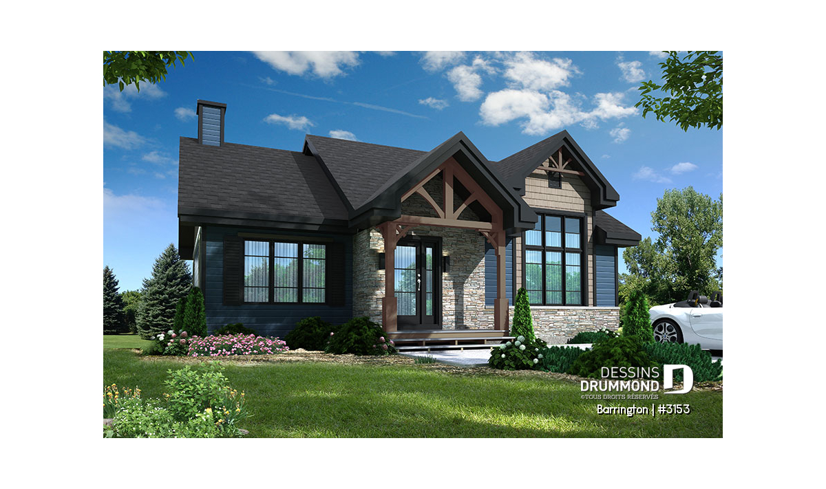 Difficile de ne pas tomber sous le charme de ce modèle au style transitionnel, qui marie avec brio le charme champêtre et rustique à la sobriété contemporaine. Pensée dans l’air du temps, cette maison séduit autant par ses poutres de bois en façade que par ses fenêtres aux moulures foncées, inspirées du design moderne. Ce modèle rustique-moderne, baptisé Barrington (plan #3153), a été soigneusement imaginé par l’équipe talentueuse de Dessins Drummond, où la créativité est toujours au rendez-vous.