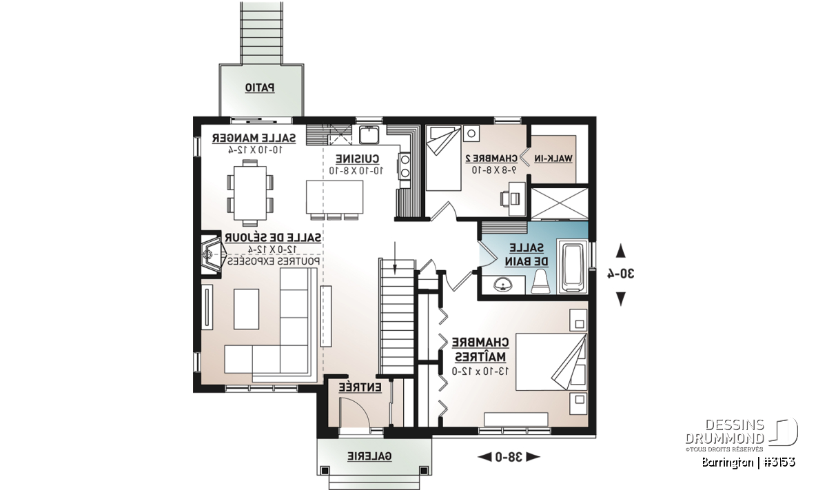 Plan maison 2 à 4 chambre, sous-sol fini optionnel ($), plafond cathédral, foyer, vestibule fermé, walk-in