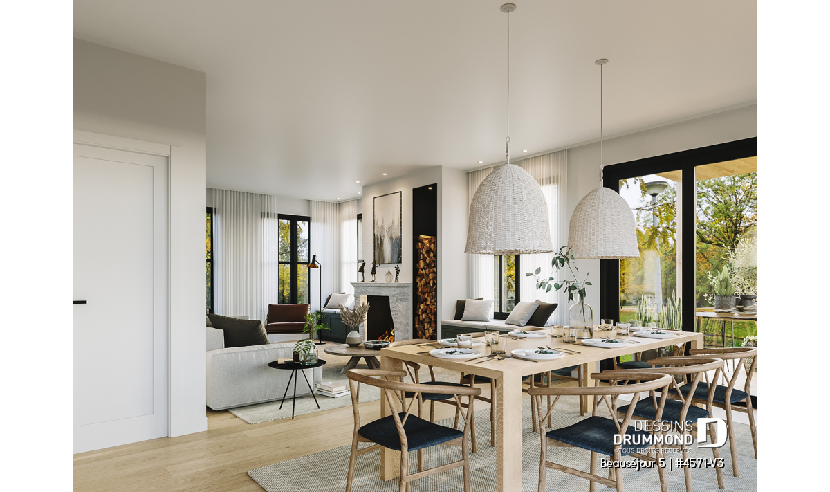 La cuisine est au fond de la maison et possède un très grand îlot, pouvant recevoir aisément 4 à 5 personnes, en plus d'un garde-manger. Ce dernier est près de l'entrée latérale de la maison, pratique pour ranger rapidement les denrées, au retour de l'épicerie! La salle de séjour est ouverte sur la salle à manger, et propose un foyer.