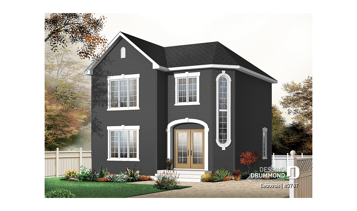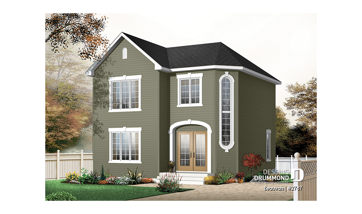 Cachet extérieur distinctif avec cette fenêtre originale permettant aussi un bien bel éclairage dans le secteur entrée principale. Belle salle de séjour et belle chambre des maîtres pour un tel format de maison. Option de deux ou trois chambres; les deux incluses au plan.